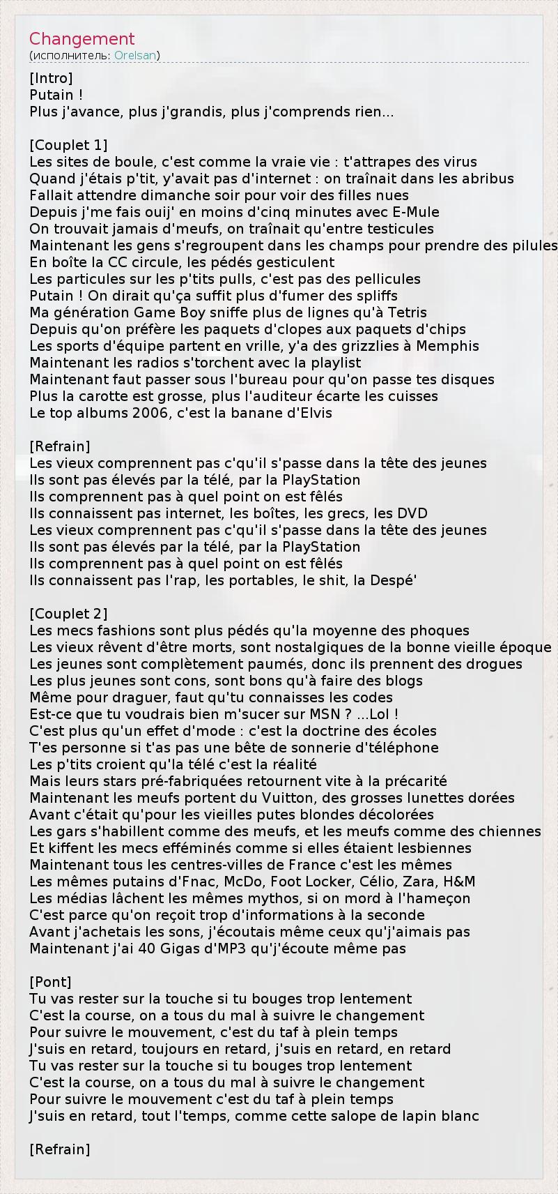 [Intro] Putain ! Plus j'avance, plus j'grandis, plus j'comprends rien... [Couplet 1] Les sites de boule, c'est comme la vraie vie : t'attrapes des virus Quand j'étais p'tit, y'avait pas d'internet : on traînait dans les abribus Fallait attendre dimanche soir pour voir des filles nues Depuis j'me fais ouij' en moins d'cinq minutes avec E-Mule On trouvait jamais d'meufs, on traînait qu'entre testicules Maintenant les gens s'regroupent dans les champs pour prendre des pilules En boîte la CC circule, les pédés gesticulent Les particules sur les p'tits pulls, c'est pas des pellicules Putain ! On dirait qu'ça suffit plus d'fumer des spliffs Ma génération Game Boy sniffe plus de lignes qu'à Tetris Depuis qu'on préfère les paquets d'clopes aux paquets d'chips Les sports d'équipe partent en vrille, y'a des grizzlies à Memphis Maintenant les radios s'torchent avec la playlist Maintenant faut passer sous l'bureau pour qu'on passe tes disques Plus la carotte est grosse, plus l'auditeur écarte les cuisses Le top albums 2006, c'est la banane d'Elvis [Refrain] Les vieux comprennent pas c'qu'il s'passe dans la tête des jeunes Ils sont pas élevés par la télé, par la PlayStation Ils comprennent pas à quel point on est fêlés Ils connaissent pas internet, les boîtes, les grecs, les DVD Les vieux comprennent pas c'qu'il s'passe dans la tête des jeunes Ils sont pas élevés par la télé, par la PlayStation Ils comprennent pas à quel point on est fêlés Ils connaissent pas l'rap, les portables, le shit, la Despé' [Couplet 2] Les mecs fashions sont plus pédés qu'la moyenne des phoques Les vieux rêvent d'être morts, sont nostalgiques de la bonne vieille époque Les jeunes sont complètement paumés, donc ils prennent des drogues Les plus jeunes sont cons, sont bons qu'à faire des blogs Même pour draguer, faut qu'tu connaisses les codes Est-ce que tu voudrais bien m'sucer sur MSN ? ...Lol ! C'est plus qu'un effet d'mode : c'est la doctrine des écoles T'es personne si t'as pas une bête de sonnerie d'téléphone Les p'tits croient qu'la télé c'est la réalité Mais leurs stars pré-fabriquées retournent vite à la précarité Maintenant les meufs portent du Vuitton, des grosses lunettes dorées Avant c'était qu'pour les vieilles putes blondes décolorées Les gars s'habillent comme des meufs, et les meufs comme des chiennes Et kiffent les mecs efféminés comme si elles étaient lesbiennes Maintenant tous les centres-villes de France c'est les mêmes Les mêmes putains d'Fnac, McDo, Foot Locker, Célio, Zara, H&M Les médias lâchent les mêmes mythos, si on mord à l'hameçon C'est parce qu'on reçoit trop d'informations à la seconde Avant j'achetais les sons, j'écoutais même ceux qu'j'aimais pas Maintenant j'ai 40 Gigas d'MP3 qu'j'écoute même pas [Pont] Tu vas rester sur la touche si tu bouges trop lentement C'est la course, on a tous du mal à suivre le changement Pour suivre le mouvement, c'est du taf à plein temps J'suis en retard, toujours en retard, j'suis en retard, en retard Tu vas rester sur la touche si tu bouges trop lentement C'est la course, on a tous du mal à suivre le changement Pour suivre le mouvement c'est du taf à plein temps J'suis en retard, tout l'temps, comme cette salope de lapin blanc [Refrain]