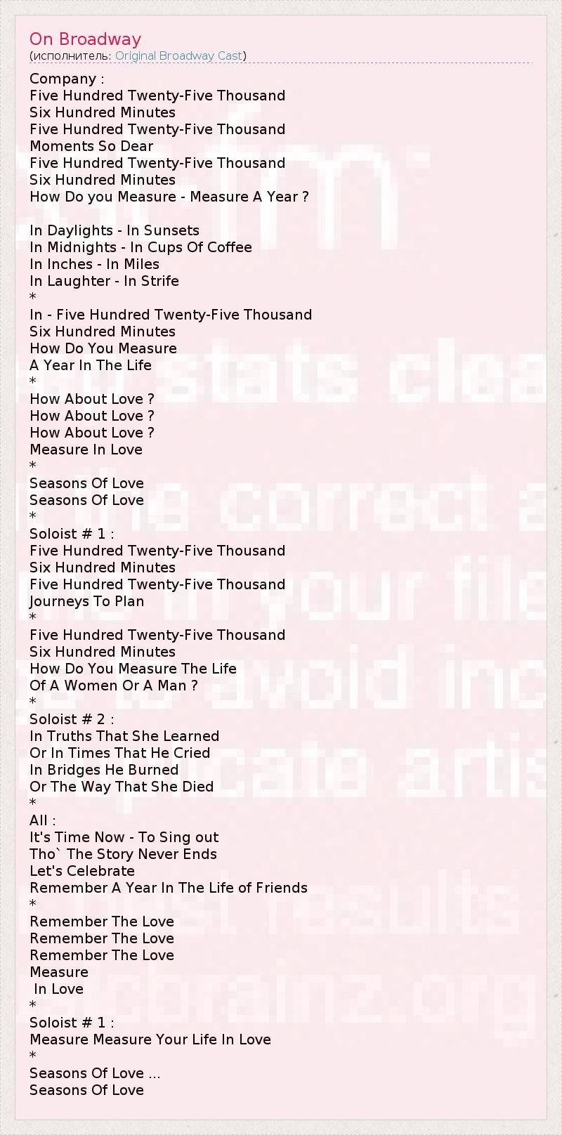 Company : Five Hundred Twenty-Five Thousand Six Hundred Minutes Five Hundred Twenty-Five Thousand Moments So Dear Five Hundred Twenty-Five Thousand Six Hundred Minutes How Do you Measure - Measure A Year ? In Daylights - In Sunsets In Midnights - In Cups Of Coffee In Inches - In Miles In Laughter - In Strife * In - Five Hundred Twenty-Five Thousand Six Hundred Minutes How Do You Measure A Year In The Life * How About Love ? How About Love ? How About Love ? Measure In Love * Seasons Of Love Seasons Of Love * Soloist # 1 : Five Hundred Twenty-Five Thousand Six Hundred Minutes Five Hundred Twenty-Five Thousand Journeys To Plan * Five Hundred Twenty-Five Thousand Six Hundred Minutes How Do You Measure The Life Of A Women Or A Man ? * Soloist # 2 : In Truths That She Learned Or In Times That He Cried In Bridges He Burned Or The Way That She Died * All : It's Time Now - To Sing out Tho` The Story Never Ends Let's Celebrate Remember A Year In The Life of Friends * Remember The Love Remember The Love Remember The Love Measure In Love * Soloist # 1 : Measure Measure Your Life In Love * Seasons Of Love ... Seasons Of Love