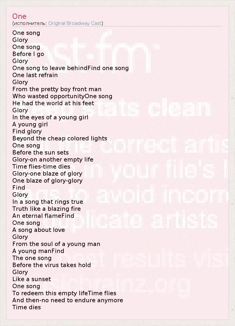 One song Glory One song Before I go Glory One song to leave behindFind one song One last refrain Glory From the pretty boy front man Who wasted opportunityOne song He had the world at his feet Glory In the eyes of a young girl A young girl Find glory Beyond the cheap colored lights One song Before the sun sets Glory-on another empty life Time flies-time dies Glory-one blaze of glory One blaze of glory-glory Find Glory In a song that rings true Truth like a blazing fire An eternal flameFind One song A song about love Glory From the soul of a young man A young manFind The one song Before the virus takes hold Glory Like a sunset One song To redeem this empty lifeTime flies And then-no need to endure anymore Time dies