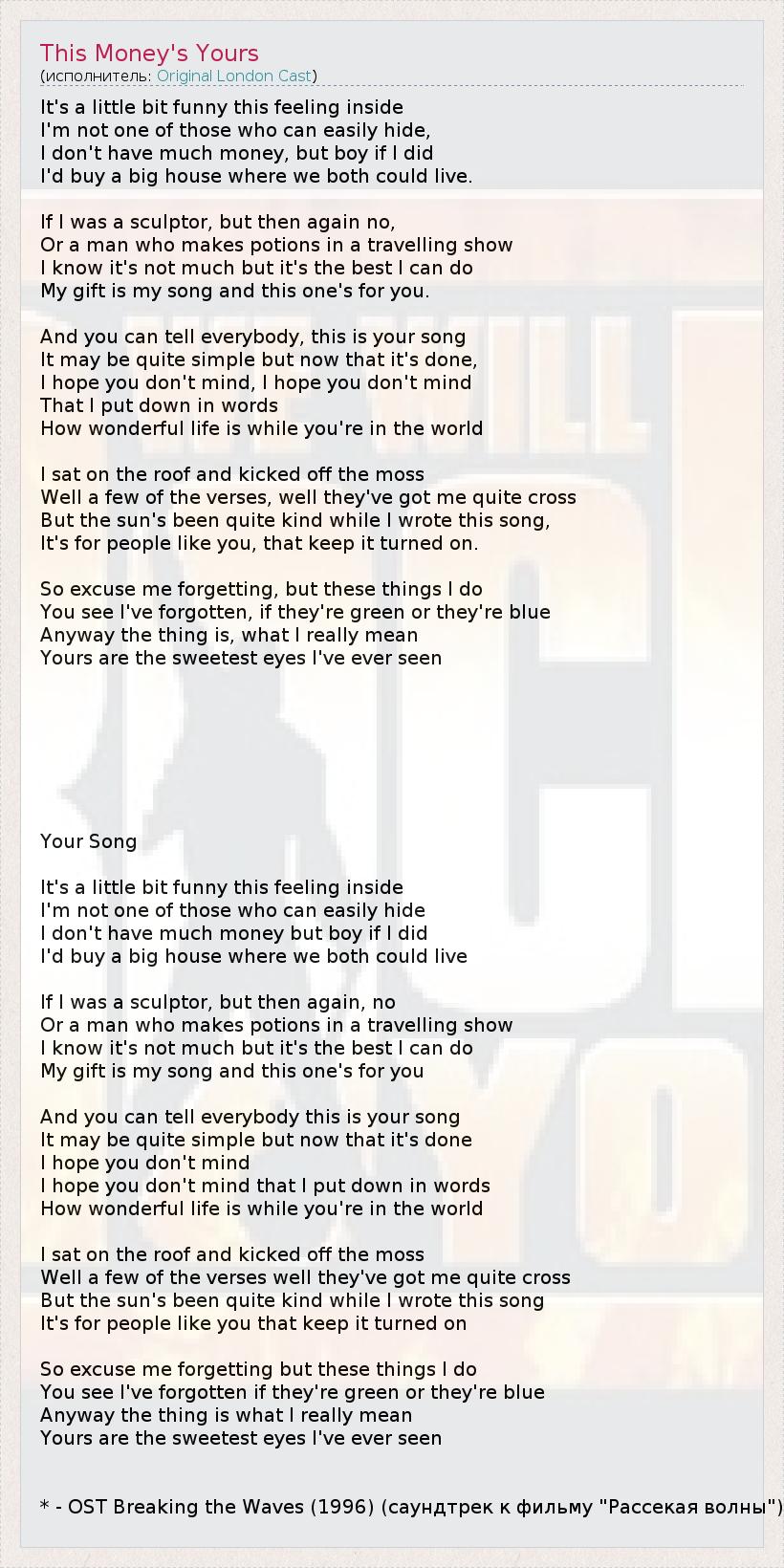 А как ты думаешь, о чем песня "This Money's Yours" ?