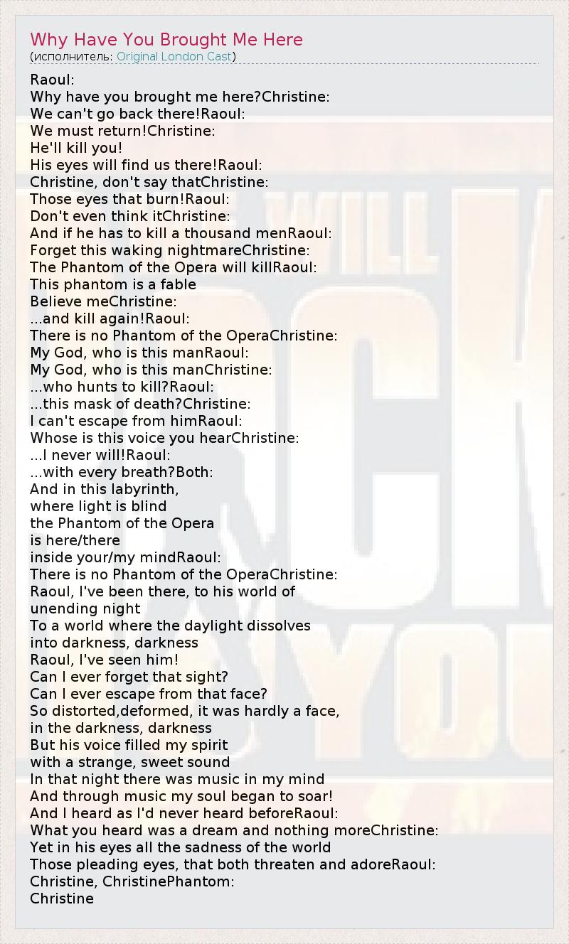 А как ты думаешь, о чем песня "Why Have You Brought Me Here" ?