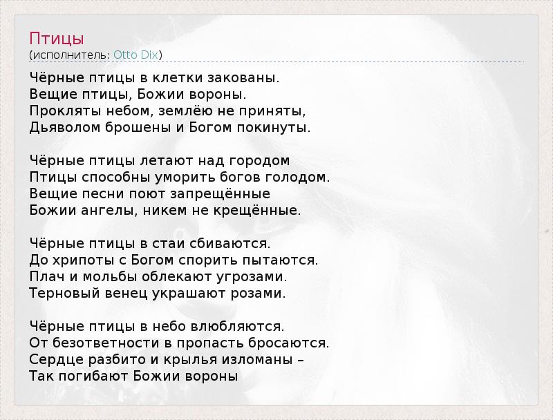 Самое необычное в звучании Otto Dix — это, пожалуй, вокал Михаэля, которому трудно найти аналог на отечественной "тёмной сцене". Это довольно редкий тип голоса – контр-тенор, то есть, Михаэль поёт в тесситуре меццо-сопрано, что может сбить слушателя с толку. Завораживающий голос искусно сочетается с продуманными стихами, полными метафор и надрезающим вены минором. Всё это рождает музыку, достойную быть названной музыкой суицидников.