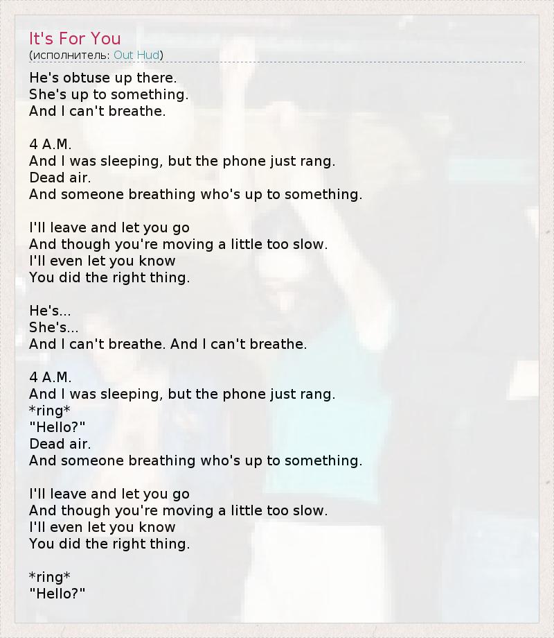 He's obtuse up there. She's up to something. And I can't breathe. 4 A.M. And I was sleeping, but the phone just rang. Dead air. And someone breathing who's up to something. I'll leave and let you go And though you're moving a little too slow. I'll even let you know You did the right thing. He's... She's... And I can't breathe. And I can't breathe. 4 A.M. And I was sleeping, but the phone just rang. *ring* "Hello?" Dead air. And someone breathing who's up to something. I'll leave and let you go And though you're moving a little too slow. I'll even let you know You did the right thing. *ring* "Hello?"