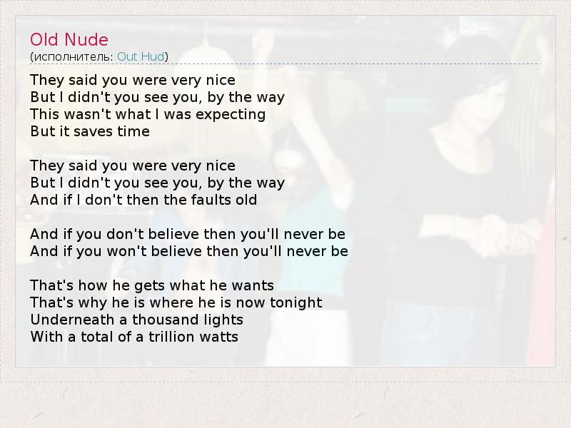 They said you were very nice But I didn't you see you, by the way This wasn't what I was expecting But it saves time They said you were very nice But I didn't you see you, by the way And if I don't then the faults old And if you don't believe then you'll never be And if you won't believe then you'll never be That's how he gets what he wants That's why he is where he is now tonight Underneath a thousand lights With a total of a trillion watts