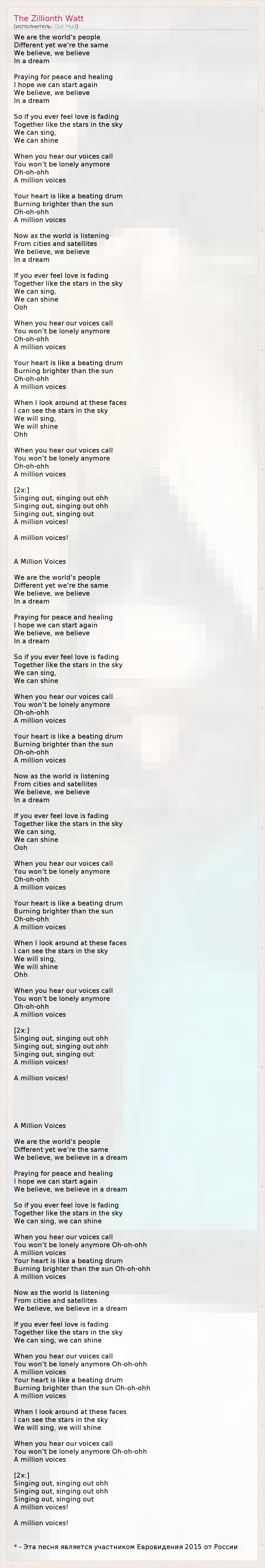 We are the world's people Different yet we're the same We believe, we believe In a dream Praying for peace and healing I hope we can start again We believe, we believe In a dream So if you ever feel love is fading Together like the stars in the sky We can sing, We can shine When you hear our voices call You won't be lonely anymore Oh-oh-ohh A million voices Your heart is like a beating drum Burning brighter than the sun Oh-oh-ohh A million voices Now as the world is listening From cities and satellites We believe, we believe In a dream If you ever feel love is fading Together like the stars in the sky We can sing, We can shine Ooh When you hear our voices call You won't be lonely anymore Oh-oh-ohh A million voices Your heart is like a beating drum Burning brighter than the sun Oh-oh-ohh A million voices When I look around at these faces I can see the stars in the sky We will sing, We will shine Ohh When you hear our voices call You won't be lonely anymore Oh-oh-ohh A million voices [2x:] Singing out, singing out ohh Singing out, singing out ohh Singing out, singing out A million voices! A million voices! A Million Voices We are the world's people Different yet we're the same We believe, we believe In a dream Praying for peace and healing I hope we can start again We believe, we believe In a dream So if you ever feel love is fading Together like the stars in the sky We can sing, We can shine When you hear our voices call You won't be lonely anymore Oh-oh-ohh A million voices Your heart is like a beating drum Burning brighter than the sun Oh-oh-ohh A million voices Now as the world is listening From cities and satellites We believe, we believe In a dream If you ever feel love is fading Together like the stars in the sky We can sing, We can shine Ooh When you hear our voices call You won't be lonely anymore Oh-oh-ohh A million voices Your heart is like a beating drum Burning brighter than the sun Oh-oh-ohh A million voices When I look around at these faces I can see the stars in the sky We will sing, We will shine Ohh When you hear our voices call You won't be lonely anymore Oh-oh-ohh A million voices [2x:] Singing out, singing out ohh Singing out, singing out ohh Singing out, singing out A million voices! A million voices! A Million Voices We are the world's people Different yet we're the same We believe, we believe in a dream Praying for peace and healing I hope we can start again We believe, we believe in a dream So if you ever feel love is fading Together like the stars in the sky We can sing, we can shine When you hear our voices call You won't be lonely anymore Oh-oh-ohh A million voices Your heart is like a beating drum Burning brighter than the sun Oh-oh-ohh A million voices Now as the world is listening From cities and satellites We believe, we believe in a dream If you ever feel love is fading Together like the stars in the sky We can sing, we can shine When you hear our voices call You won't be lonely anymore Oh-oh-ohh A million voices Your heart is like a beating drum Burning brighter than the sun Oh-oh-ohh A million voices When I look around at these faces I can see the stars in the sky We will sing, we will shine When you hear our voices call You won't be lonely anymore Oh-oh-ohh A million voices [2x:] Singing out, singing out ohh Singing out, singing out ohh Singing out, singing out A million voices! A million voices! * - Эта песня является участником Евровидения 2015 от России