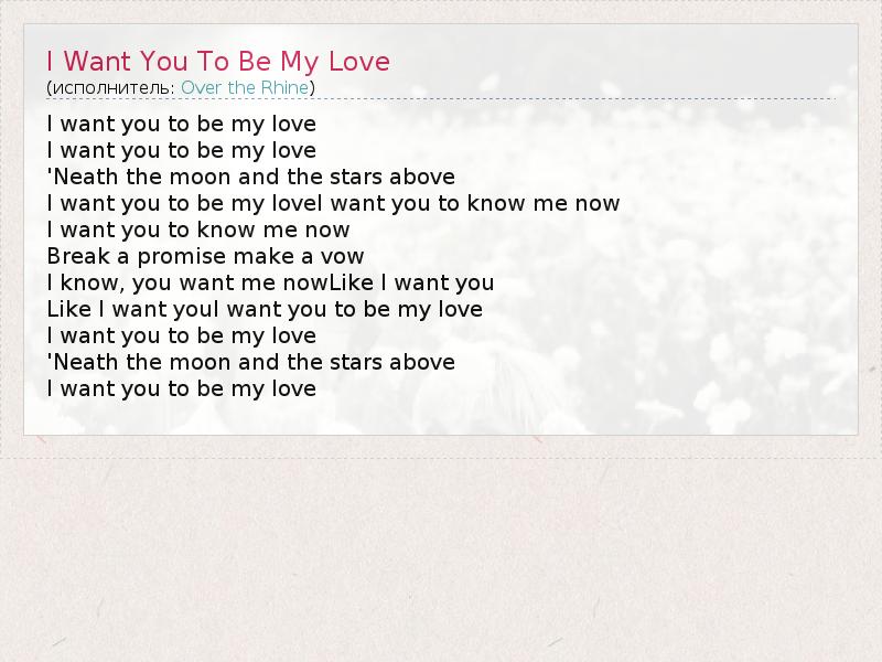 I want you to be my love I want you to be my love 'Neath the moon and the stars above I want you to be my loveI want you to know me now I want you to know me now Break a promise make a vow I know, you want me nowLike I want you Like I want youI want you to be my love I want you to be my love 'Neath the moon and the stars above I want you to be my love