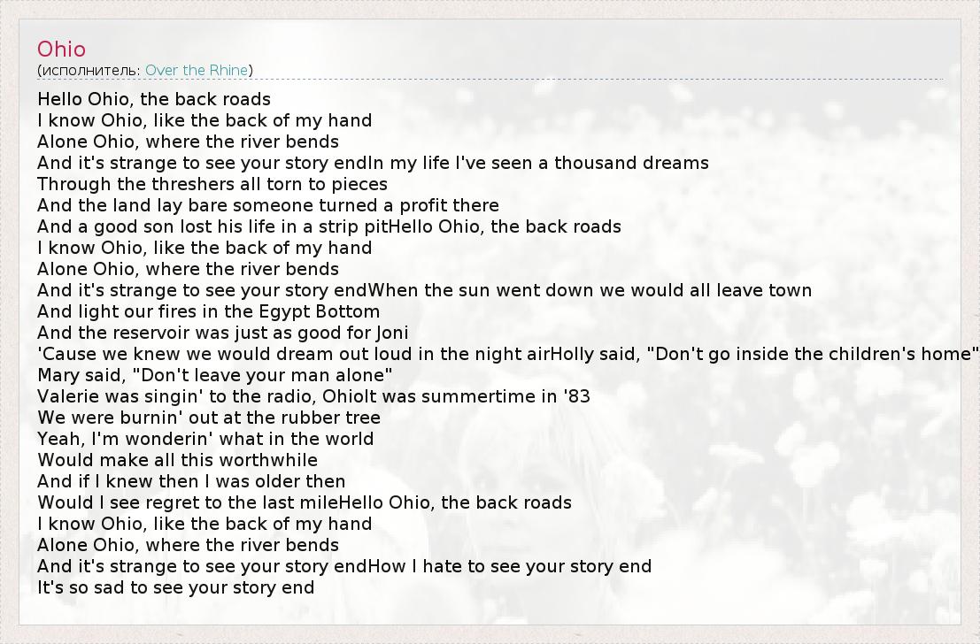 Hello Ohio, the back roads I know Ohio, like the back of my hand Alone Ohio, where the river bends And it's strange to see your story endIn my life I've seen a thousand dreams Through the threshers all torn to pieces And the land lay bare someone turned a profit there And a good son lost his life in a strip pitHello Ohio, the back roads I know Ohio, like the back of my hand Alone Ohio, where the river bends And it's strange to see your story endWhen the sun went down we would all leave town And light our fires in the Egypt Bottom And the reservoir was just as good for Joni 'Cause we knew we would dream out loud in the night airHolly said, "Don't go inside the children's home" Mary said, "Don't leave your man alone" Valerie was singin' to the radio, OhioIt was summertime in '83 We were burnin' out at the rubber tree Yeah, I'm wonderin' what in the world Would make all this worthwhile And if I knew then I was older then Would I see regret to the last mileHello Ohio, the back roads I know Ohio, like the back of my hand Alone Ohio, where the river bends And it's strange to see your story endHow I hate to see your story end It's so sad to see your story end