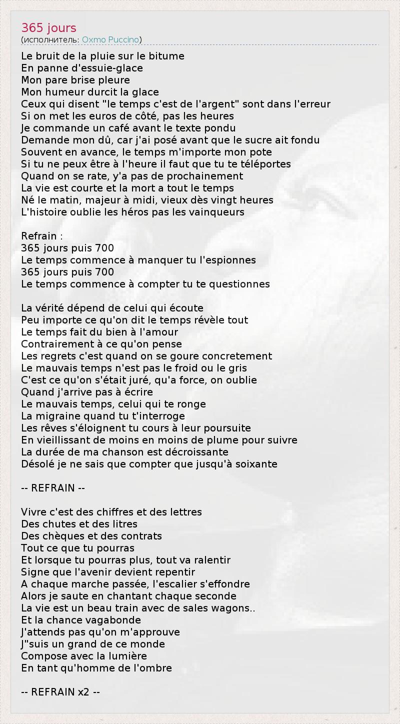 Это интересно:Абдулай Диарра – настоящее имя Oxmo Puccino – родился в 1974 в Мали (государство на северо-западе Африки). Через год его семья переезжает в Париж, а к пяти годам Oxmo – в 19 округ Парижа, где он живет и сейчас. После выхода своего первого альбома в одном из интервью он признался, что мог бы сменить кварталы 19 пригорода на другую обстановку, так как другая среда во многом бы повлияла на его дальнейшую... продолжение