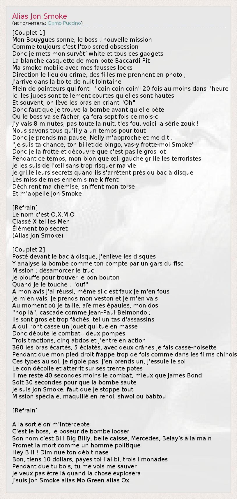 [Couplet 1] Mon Bouygues sonne, le boss : nouvelle mission Comme toujours c'est l'top scred obsession Donc je mets mon survèt’ white et tous ces gadgets La blanche casquette de mon pote Baccardi Pit Ma smoke mobile avec mes fausses locks Direction le lieu du crime, des filles me prennent en photo ; J'arrive dans la boite de nuit lointaine Plein de pointeurs qui font : "coin coin coin" 20 fois au moins dans l'heure Ici les jupes sont tellement courtes qu'elles sont hautes Et souvent, on lève les bras en criant "Oh" Donc faut que je trouve la bombe avant qu'elle pète Ou le boss va se fâcher, ça fera sept fois ce mois-ci J'y vais 8 minutes, pas toute la nuit, t'es fou, voici la série zouk ! Nous savons tous qu'il y a un temps pour tout Donc je prends ma pause, Nelly m'approche et me dit : "Je suis ta chance, ton billet de bingo, vas-y frotte-moi Smoke" Donc je la frotte et découvre que c'est pas le gros lot Pendant ce temps, mon bionique œil gauche grille les terroristes Je les suis de l'œil sans trop risquer ma vie Je grille leurs secrets quand ils s'arrêtent près du bac à disque Les miss de mes ennemis me kiffent Déchirent ma chemise, sniffent mon torse Et m'appelle Jon Smoke [Refrain] Le nom c'est O.X.M.O Classé X tel les Men Élément top secret (Alias Jon Smoke) [Couplet 2] Posté devant le bac à disque, j'enlève les disques Y analyse la bombe comme ton compte par un gars du fisc Mission : désamorcer le truc Je plouffe pour trouver le bon bouton Quand je le touche : "ouf" A mon avis j'ai réussi, même si c'est faux je m'en fous Je m'en vais, je prends mon veston et je m'en vais Au moment où je taille, aïe mes épaules, mon dos "hop là", cascade comme Jean-Paul Belmondo ; Ils sont gros et trop fâchés, tel un tas d'assassins A qui l’ont casse un jouet qui tue en masse Donc débute le combat : deux pompes Trois tractions, cinq abdos et j'entre en action 360 les bras écartés, 5 éclatés, avec deux crânes je fais casse-noisette Pendant que mon pied droit frappe trop de fois comme dans les films chinois Ces types au sol, je rigole pas, j'en prends un, j'essuie le sol Le con décolle et atterrit sur ses trente potes Il me reste 40 secondes moins le combat, mieux que James Bond Soit 30 secondes pour que la bombe saute Je suis Jon Smoke, faut que je stoppe tout Mission spéciale, maquillé en renoi, shwol ou babtou [Refrain] A la sortie on m'intercepte C'est le boss, le poseur de bombe looser Son nom c’est Bill Big Billy, belle caisse, Mercedes, Belay’s à la main Promet la mort comme un homme politique Hey Bill ! Diminue ton débit nase Bon, tiens 10 dollars, payes toi l'alibi, trois limonades Pendant que tu bois, tu me vois me sauver Je veux pas être là quand la chose explosera J'suis Jon Smoke alias Mo Green alias Ox