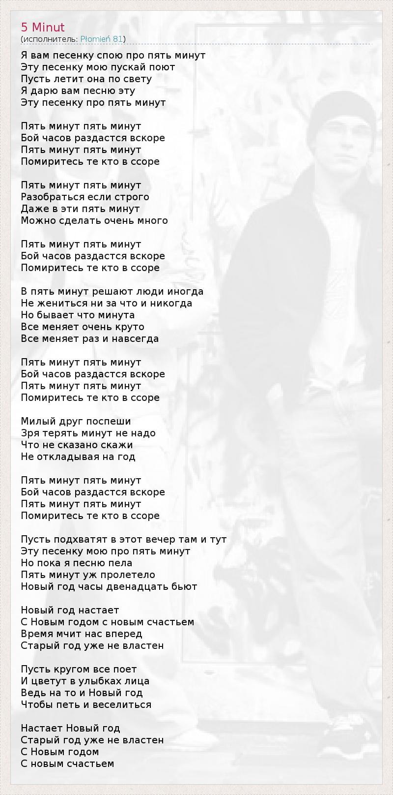Я вам песенку спою про пять минут Эту песенку мою пускай поют Пусть летит она по свету Я дарю вам песню эту Эту песенку про пять минут Пять минут пять минут Бой часов раздастся вскоре Пять минут пять минут Помиритесь те кто в ссоре Пять минут пять минут Разобраться если строго Даже в эти пять минут Можно сделать очень много Пять минут пять минут Бой часов раздастся вскоре Помиритесь те кто в ссоре В пять минут решают люди иногда Не жениться ни за что и никогда Но бывает что минута Все меняет очень круто Все меняет раз и навсегда Пять минут пять минут Бой часов раздастся вскоре Пять минут пять минут Помиритесь те кто в ссоре Милый друг поспеши Зря терять минут не надо Что не сказано скажи Не откладывая на год Пять минут пять минут Бой часов раздастся вскоре Пять минут пять минут Помиритесь те кто в ссоре Пусть подхватят в этот вечер там и тут Эту песенку мою про пять минут Но пока я песню пела Пять минут уж пролетело Новый год часы двенадцать бьют Новый год настает С Новым годом с новым счастьем Время мчит нас вперед Старый год уже не властен Пусть кругом все поет И цветут в улыбках лица Ведь на то и Новый год Чтобы петь и веселиться Настает Новый год Старый год уже не властен С Новым годом С новым счастьем