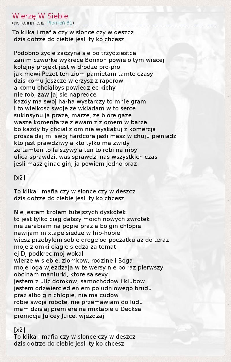 To klika i mafia czy w slonce czy w deszcz dzis dotrze do ciebie jesli tylko chcesz Podobno zycie zaczyna sie po trzydziestce zanim czworke wykrece Borixon powie o tym wiecej kolejny projekt jest w drodze pro-pro jak mowi Pezet ten ziom pamietam tamte czasy dzis komu jeszcze wierzysz z raperow a komu chcialbys powiedziec kichy nie rob, zawijaj sie napredce kazdy ma swoj ha-ha wystarczy to mnie gram i to wielkosc swoje ze wkladam w to serce sukinsynu ja praze, marze, ze biore gaze wasze komentarze zlewam z ziomem w barze bo kazdy by chcial ziom nie wyskakuj z komercja prosze daj mi swoj hardcore jesli masz w chuju pieniadz kto jest prawdziwy a kto tylko ma zwidy ze tamten to falszywy a ten to robi na niby ulica sprawdzi, was sprawdzi nas wszystkich czas jesli masz ginac gin, ja powiem jedno praz [x2] To klika i mafia czy w slonce czy w deszcz dzis dotrze do ciebie jesli tylko chcesz Nie jestem krolem tutejszych dyskotek to jest tylko ciag dalszy moich nowych zwrotek nie zarabiam na popie praz albo gin chlopie nawijam mixtape siedze w hip-hopie wiesz przebylem sobie droge od poczatku az do teraz moje ziomki ciagle siedza za temat ej DJ podkrec moj wokal wierze w siebie, ziomkow, rodzine i Boga moje loga wjezdzaja w te wersy nie po raz pierwszy obcinam maniurki, ktore sa sexy jestem z ulic domkow, samochodow i klubow jestem odzwierciedleniem poludniowego brudu praz albo gin chlopie, nie ma cudow robie swoja robote, nie przemawiam do ludu mam dzisiaj premiere na mixtapie u Decksa promocja Juicey Juice, wjezdzaj [x2] To klika i mafia czy w slonce czy w deszcz dzis dotrze do ciebie jesli tylko chcesz