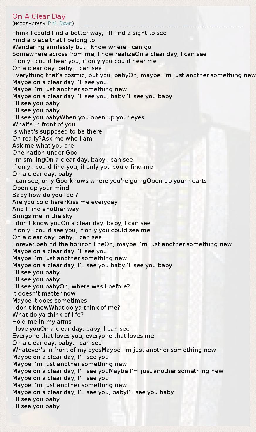 Think I could find a better way, I'll find a sight to see Find a place that I belong to Wandering aimlessly but I know where I can go Somewhere across from me, I now realizeOn a clear day, I can see If only I could hear you, if only you could hear me On a clear day, baby, I can see Everything that's cosmic, but you, babyOh, maybe I'm just another something new Maybe on a clear day I'll see you Maybe I'm just another something new Maybe on a clear day I'll see you, babyI'll see you baby I'll see you baby I'll see you baby I'll see you babyWhen you open up your eyes What's in front of you Is what's supposed to be there Oh really?Ask me who I am Ask me what you are One nation under God I'm smilingOn a clear day, baby I can see If only I could find you, if only you could find me On a clear day, baby I can see, only God knows where you're goingOpen up your hearts Open up your mind Baby how do you feel? Are you cold here?Kiss me everyday And I find another way Brings me in the sky I don't know youOn a clear day, baby, I can see If only I could see you, if only you could see me On a clear day, baby, I can see Forever behind the horizon lineOh, maybe I'm just another something new Maybe on a clear day I'll see you Maybe I'm just another something new Maybe on a clear day, I'll see you babyI'll see you baby I'll see you baby I'll see you baby I'll see you babyOh, where was I before? It doesn't matter now Maybe it does sometimes I don't knowWhat do ya think of me? What do ya think of life? Hold me in my arms I love youOn a clear day, baby, I can see Everyone that loves you, everyone that loves me On a clear day, baby, I can see Whatever's in front of my eyesMaybe I'm just another something new Maybe on a clear day, I'll see you Maybe I'm just another something new Maybe on a clear day, I'll see youMaybe I'm just another something new Maybe on a clear day, I'll see you Maybe I'm just another something new Maybe on a clear day, I'll see you, babyI'll see you baby I'll see you baby I'll see you baby ...
