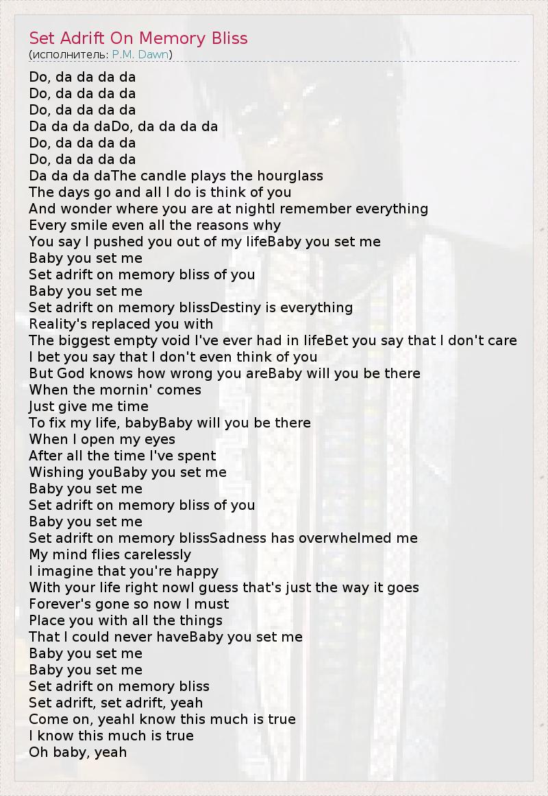 Do, da da da da Do, da da da da Do, da da da da Da da da daDo, da da da da Do, da da da da Do, da da da da Da da da daThe candle plays the hourglass The days go and all I do is think of you And wonder where you are at nightI remember everything Every smile even all the reasons why You say I pushed you out of my lifeBaby you set me Baby you set me Set adrift on memory bliss of you Baby you set me Set adrift on memory blissDestiny is everything Reality's replaced you with The biggest empty void I've ever had in lifeBet you say that I don't care I bet you say that I don't even think of you But God knows how wrong you areBaby will you be there When the mornin' comes Just give me time To fix my life, babyBaby will you be there When I open my eyes After all the time I've spent Wishing youBaby you set me Baby you set me Set adrift on memory bliss of you Baby you set me Set adrift on memory blissSadness has overwhelmed me My mind flies carelessly I imagine that you're happy With your life right nowI guess that's just the way it goes Forever's gone so now I must Place you with all the things That I could never haveBaby you set me Baby you set me Baby you set me Set adrift on memory bliss Set adrift, set adrift, yeah Come on, yeahI know this much is true I know this much is true Oh baby, yeah