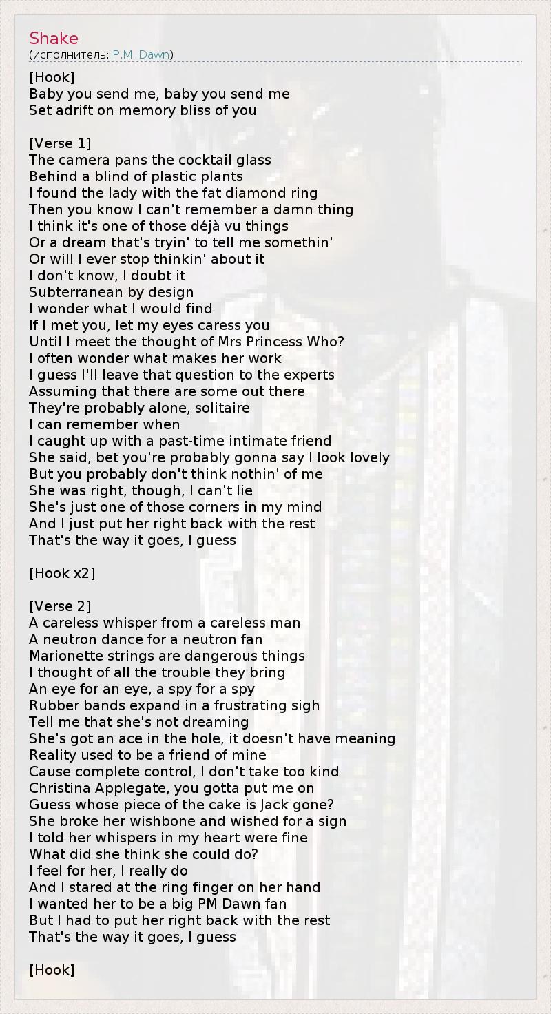 [Hook] Baby you send me, baby you send me Set adrift on memory bliss of you [Verse 1] The camera pans the cocktail glass Behind a blind of plastic plants I found the lady with the fat diamond ring Then you know I can't remember a damn thing I think it's one of those déjà vu things Or a dream that's tryin' to tell me somethin' Or will I ever stop thinkin' about it I don't know, I doubt it Subterranean by design I wonder what I would find If I met you, let my eyes caress you Until I meet the thought of Mrs Princess Who? I often wonder what makes her work I guess I'll leave that question to the experts Assuming that there are some out there They're probably alone, solitaire I can remember when I caught up with a past-time intimate friend She said, bet you're probably gonna say I look lovely But you probably don't think nothin' of me She was right, though, I can't lie She's just one of those corners in my mind And I just put her right back with the rest That's the way it goes, I guess [Hook x2] [Verse 2] A careless whisper from a careless man A neutron dance for a neutron fan Marionette strings are dangerous things I thought of all the trouble they bring An eye for an eye, a spy for a spy Rubber bands expand in a frustrating sigh Tell me that she's not dreaming She's got an ace in the hole, it doesn't have meaning Reality used to be a friend of mine Cause complete control, I don't take too kind Christina Applegate, you gotta put me on Guess whose piece of the cake is Jack gone? She broke her wishbone and wished for a sign I told her whispers in my heart were fine What did she think she could do? I feel for her, I really do And I stared at the ring finger on her hand I wanted her to be a big PM Dawn fan But I had to put her right back with the rest That's the way it goes, I guess [Hook]