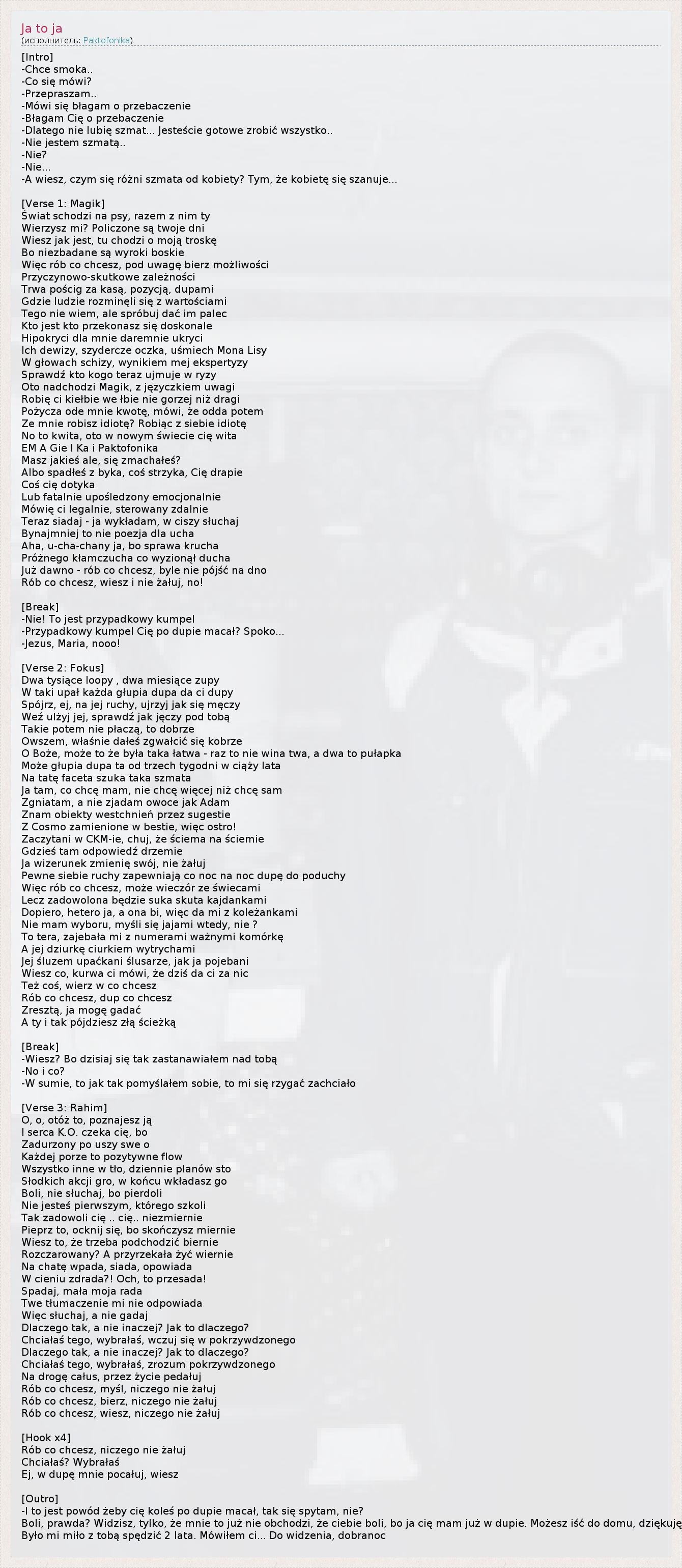 [Intro] -Chce smoka.. -Co się mówi? -Przepraszam.. -Mówi się błagam o przebaczenie -Błagam Cię o przebaczenie -Dlatego nie lubię szmat... Jesteście gotowe zrobić wszystko.. -Nie jestem szmatą.. -Nie? -Nie... -A wiesz, czym się różni szmata od kobiety? Tym, że kobietę się szanuje... [Verse 1: Magik] Świat schodzi na psy, razem z nim ty Wierzysz mi? Policzone są twoje dni Wiesz jak jest, tu chodzi o moją troskę Bo niezbadane są wyroki boskie Więc rób co chcesz, pod uwagę bierz możliwości Przyczynowo-skutkowe zależności Trwa pościg za kasą, pozycją, dupami Gdzie ludzie rozminęli się z wartościami Tego nie wiem, ale spróbuj dać im palec Kto jest kto przekonasz się doskonale Hipokryci dla mnie daremnie ukryci Ich dewizy, szydercze oczka, uśmiech Mona Lisy W głowach schizy, wynikiem mej ekspertyzy Sprawdź kto kogo teraz ujmuje w ryzy Oto nadchodzi Magik, z języczkiem uwagi Robię ci kiełbie we łbie nie gorzej niż dragi Pożycza ode mnie kwotę, mówi, że odda potem Ze mnie robisz idiotę? Robiąc z siebie idiotę No to kwita, oto w nowym świecie cię wita EM A Gie I Ka i Paktofonika Masz jakieś ale, się zmachałeś? Albo spadłeś z byka, coś strzyka, Cię drapie Coś cię dotyka Lub fatalnie upośledzony emocjonalnie Mówię ci legalnie, sterowany zdalnie Teraz siadaj - ja wykładam, w ciszy słuchaj Bynajmniej to nie poezja dla ucha Aha, u-cha-chany ja, bo sprawa krucha Próżnego kłamczucha co wyzionął ducha Już dawno - rób co chcesz, byle nie pójść na dno Rób co chcesz, wiesz i nie żałuj, no! [Break] -Nie! To jest przypadkowy kumpel -Przypadkowy kumpel Cię po dupie macał? Spoko... -Jezus, Maria, nooo! [Verse 2: Fokus] Dwa tysiące loopy , dwa miesiące zupy W taki upał każda głupia dupa da ci dupy Spójrz, ej, na jej ruchy, ujrzyj jak się męczy Weź ulżyj jej, sprawdź jak jęczy pod tobą Takie potem nie płaczą, to dobrze Owszem, właśnie dałeś zgwałcić się kobrze O Boże, może to że była taka łatwa - raz to nie wina twa, a dwa to pułapka Może głupia dupa ta od trzech tygodni w ciąży lata Na tatę faceta szuka taka szmata Ja tam, co chcę mam, nie chcę więcej niż chcę sam Zgniatam, a nie zjadam owoce jak Adam Znam obiekty westchnień przez sugestie Z Cosmo zamienione w bestie, więc ostro! Zaczytani w CKM-ie, chuj, że ściema na ściemie Gdzieś tam odpowiedź drzemie Ja wizerunek zmienię swój, nie żałuj Pewne siebie ruchy zapewniają co noc na noc dupę do poduchy Więc rób co chcesz, może wieczór ze świecami Lecz zadowolona będzie suka skuta kajdankami Dopiero, hetero ja, a ona bi, więc da mi z koleżankami Nie mam wyboru, myśli się jajami wtedy, nie ? To tera, zajebała mi z numerami ważnymi komórkę A jej dziurkę ciurkiem wytrychami Jej śluzem upaćkani ślusarze, jak ja pojebani Wiesz co, kurwa ci mówi, że dziś da ci za nic Też coś, wierz w co chcesz Rób co chcesz, dup co chcesz Zresztą, ja mogę gadać A ty i tak pójdziesz złą ścieżką [Break] -Wiesz? Bo dzisiaj się tak zastanawiałem nad tobą -No i co? -W sumie, to jak tak pomyślałem sobie, to mi się rzygać zachciało [Verse 3: Rahim] O, o, otóż to, poznajesz ją I serca K.O. czeka cię, bo Zadurzony po uszy swe o Każdej porze to pozytywne flow Wszystko inne w tło, dziennie planów sto Słodkich akcji gro, w końcu wkładasz go Boli, nie słuchaj, bo pierdoli Nie jesteś pierwszym, którego szkoli Tak zadowoli cię .. cię.. niezmiernie Pieprz to, ocknij się, bo skończysz miernie Wiesz to, że trzeba podchodzić biernie Rozczarowany? A przyrzekała żyć wiernie Na chatę wpada, siada, opowiada W cieniu zdrada?! Och, to przesada! Spadaj, mała moja rada Twe tłumaczenie mi nie odpowiada Więc słuchaj, a nie gadaj Dlaczego tak, a nie inaczej? Jak to dlaczego? Chciałaś tego, wybrałaś, wczuj się w pokrzywdzonego Dlaczego tak, a nie inaczej? Jak to dlaczego? Chciałaś tego, wybrałaś, zrozum pokrzywdzonego Na drogę całus, przez życie pedałuj Rób co chcesz, myśl, niczego nie żałuj Rób co chcesz, bierz, niczego nie żałuj Rób co chcesz, wiesz, niczego nie żałuj [Hook x4] Rób co chcesz, niczego nie żałuj Chciałaś? Wybrałaś Ej, w dupę mnie pocałuj, wiesz [Outro] -I to jest powód żeby cię koleś po dupie macał, tak się spytam, nie? Boli, prawda? Widzisz, tylko, że mnie to już nie obchodzi, że ciebie boli, bo ja cię mam już w dupie. Możesz iść do domu, dziękuję Było mi miło z tobą spędzić 2 lata. Mówiłem ci... Do widzenia, dobranoc