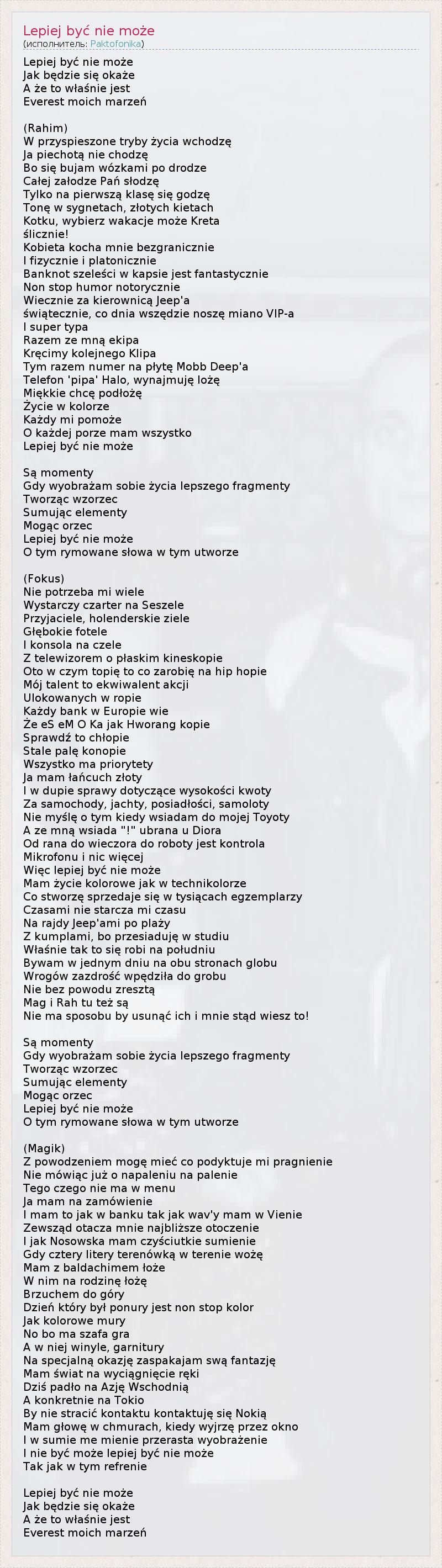 Lepiej być nie może Jak będzie się okaże A że to właśnie jest Everest moich marzeń (Rahim) W przyspieszone tryby życia wchodzę Ja piechotą nie chodzę Bo się bujam wózkami po drodze Całej załodze Pań słodzę Tylko na pierwszą klasę się godzę Tonę w sygnetach, złotych kietach Kotku, wybierz wakacje może Kreta ślicznie! Kobieta kocha mnie bezgranicznie I fizycznie i platonicznie Banknot szeleści w kapsie jest fantastycznie Non stop humor notorycznie Wiecznie za kierownicą Jeep'a świątecznie, co dnia wszędzie noszę miano VIP-a I super typa Razem ze mną ekipa Kręcimy kolejnego Klipa Tym razem numer na płytę Mobb Deep'a Telefon 'pipa' Halo, wynajmuję lożę Miękkie chcę podłożę Życie w kolorze Każdy mi pomoże O każdej porze mam wszystko Lepiej być nie może Są momenty Gdy wyobrażam sobie życia lepszego fragmenty Tworząc wzorzec Sumując elementy Mogąc orzec Lepiej być nie może O tym rymowane słowa w tym utworze (Fokus) Nie potrzeba mi wiele Wystarczy czarter na Seszele Przyjaciele, holenderskie ziele Głębokie fotele I konsola na czele Z telewizorem o płaskim kineskopie Oto w czym topię to co zarobię na hip hopie Mój talent to ekwiwalent akcji Ulokowanych w ropie Każdy bank w Europie wie Że eS eM O Ka jak Hworang kopie Sprawdź to chłopie Stale palę konopie Wszystko ma priorytety Ja mam łańcuch złoty I w dupie sprawy dotyczące wysokości kwoty Za samochody, jachty, posiadłości, samoloty Nie myślę o tym kiedy wsiadam do mojej Toyoty A ze mną wsiada "!" ubrana u Diora Od rana do wieczora do roboty jest kontrola Mikrofonu i nic więcej Więc lepiej być nie może Mam życie kolorowe jak w technikolorze Co stworzę sprzedaje się w tysiącach egzemplarzy Czasami nie starcza mi czasu Na rajdy Jeep'ami po plaży Z kumplami, bo przesiaduję w studiu Właśnie tak to się robi na południu Bywam w jednym dniu na obu stronach globu Wrogów zazdrość wpędziła do grobu Nie bez powodu zresztą Mag i Rah tu też są Nie ma sposobu by usunąć ich i mnie stąd wiesz to! Są momenty Gdy wyobrażam sobie życia lepszego fragmenty Tworząc wzorzec Sumując elementy Mogąc orzec Lepiej być nie może O tym rymowane słowa w tym utworze (Magik) Z powodzeniem mogę mieć co podyktuje mi pragnienie Nie mówiąc już o napaleniu na palenie Tego czego nie ma w menu Ja mam na zamówienie I mam to jak w banku tak jak wav'y mam w Vienie Zewsząd otacza mnie najbliższe otoczenie I jak Nosowska mam czyściutkie sumienie Gdy cztery litery terenówką w terenie wożę Mam z baldachimem łoże W nim na rodzinę łożę Brzuchem do góry Dzień który był ponury jest non stop kolor Jak kolorowe mury No bo ma szafa gra A w niej winyle, garnitury Na specjalną okazję zaspakajam swą fantazję Mam świat na wyciągnięcie ręki Dziś padło na Azję Wschodnią A konkretnie na Tokio By nie stracić kontaktu kontaktuję się Nokią Mam głowę w chmurach, kiedy wyjrzę przez okno I w sumie me mienie przerasta wyobrażenie I nie być może lepiej być nie może Tak jak w tym refrenie Lepiej być nie może Jak będzie się okaże A że to właśnie jest Everest moich marzeń
