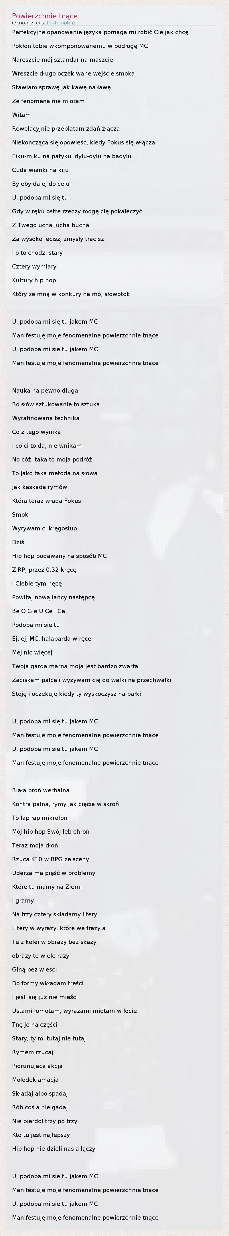 Perfekcyjne opanowanie języka pomaga mi robić Cię jak chcę Pokłon tobie wkomponowanemu w podłogę MC Nareszcie mój sztandar na maszcie Wreszcie długo oczekiwane wejście smoka Stawiam sprawę jak kawę na ławę Że fenomenalnie miotam Witam Rewelacyjnie przeplatam zdań złącza Niekończąca się opowieść, kiedy Fokus się włącza Fiku-miku na patyku, dylu-dylu na badylu Cuda wianki na kiju Byleby dalej do celu U, podoba mi się tu Gdy w ręku ostre rzeczy mogę cię pokaleczyć Z Twego ucha jucha bucha Za wysoko lecisz, zmysły tracisz I o to chodzi stary Cztery wymiary Kultury hip hop Który ze mną w konkury na mój słowotok U, podoba mi się tu jakem MC Manifestuję moje fenomenalne powierzchnie tnące U, podoba mi się tu jakem MC Manifestuję moje fenomenalne powierzchnie tnące Nauka na pewno długa Bo słów sztukowanie to sztuka Wyrafinowana technika Co z tego wynika I co ci to da, nie wnikam No cóż, taka to moja podróż To jako taka metoda na słowa Jak kaskada rymów Którą teraz włada Fokus Smok Wyrywam ci kręgosłup Dziś Hip hop podawany na sposób MC Z RP, przez 0.32 kręcę I Ciebie tym nęcę Powitaj nową lancy następcę Be O Gie U Ce I Ce Podoba mi się tu Ej, ej, MC, halabarda w ręce Mej nic więcej Twoja garda marna moja jest bardzo zwarta Zaciskam palce i wyzywam cię do walki na przechwałki Stoję i oczekuję kiedy ty wyskoczysz na pałki U, podoba mi się tu jakem MC Manifestuję moje fenomenalne powierzchnie tnące U, podoba mi się tu jakem MC Manifestuję moje fenomenalne powierzchnie tnące Biała broń werbalna Kontra palna, rymy jak cięcia w skroń To łap łap mikrofon Mój hip hop Swój łeb chroń Teraz moja dłoń Rzuca K10 w RPG ze sceny Uderza ma pięść w problemy Które tu mamy na Ziemi I gramy Na trzy cztery składamy litery Litery w wyrazy, które we frazy a Te z kolei w obrazy bez skazy obrazy te wiele razy Giną bez wieści Do formy wkładam treści I jeśli się już nie mieści Ustami łomotam, wyrazami miotam w locie Tnę je na części Stary, ty mi tutaj nie tutaj Rymem rzucaj Piorunująca akcja Molodeklamacja Składaj albo spadaj Rób coś a nie gadaj Nie pierdol trzy po trzy Kto tu jest najlepszy Hip hop nie dzieli nas a łączy U, podoba mi się tu jakem MC Manifestuję moje fenomenalne powierzchnie tnące U, podoba mi się tu jakem MC Manifestuję moje fenomenalne powierzchnie tnące