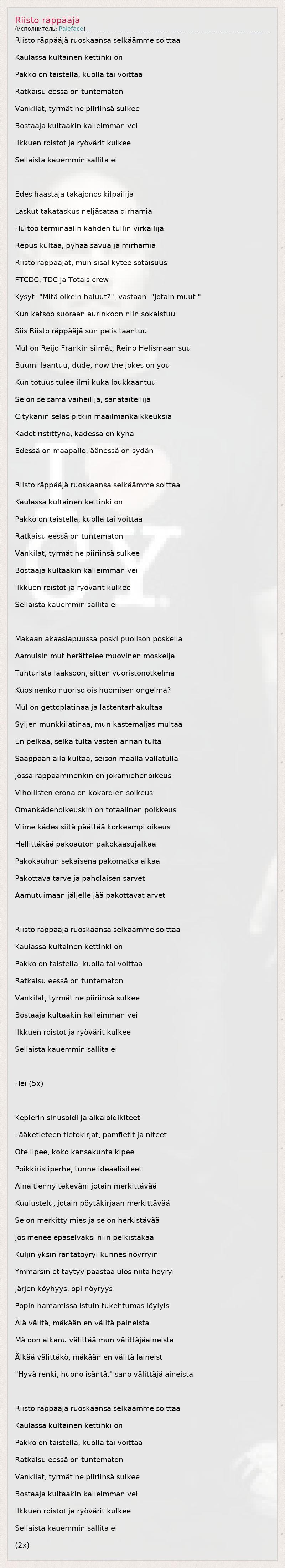 Riisto räppääjä ruoskaansa selkäämme soittaa Kaulassa kultainen kettinki on Pakko on taistella, kuolla tai voittaa Ratkaisu eessä on tuntematon Vankilat, tyrmät ne piiriinsä sulkee Bostaaja kultaakin kalleimman vei Ilkkuen roistot ja ryövärit kulkee Sellaista kauemmin sallita ei Edes haastaja takajonos kilpailija Laskut takataskus neljäsataa dirhamia Huitoo terminaalin kahden tullin virkailija Repus kultaa, pyhää savua ja mirhamia Riisto räppääjät, mun sisäl kytee sotaisuus FTCDC, TDC ja Totals crew Kysyt: "Mitä oikein haluut?", vastaan: "Jotain muut." Kun katsoo suoraan aurinkoon niin sokaistuu Siis Riisto räppääjä sun pelis taantuu Mul on Reijo Frankin silmät, Reino Helismaan suu Buumi laantuu, dude, now the jokes on you Kun totuus tulee ilmi kuka loukkaantuu Se on se sama vaiheilija, sanataiteilija Citykanin seläs pitkin maailmankaikkeuksia Kädet ristittynä, kädessä on kynä Edessä on maapallo, äänessä on sydän Riisto räppääjä ruoskaansa selkäämme soittaa Kaulassa kultainen kettinki on Pakko on taistella, kuolla tai voittaa Ratkaisu eessä on tuntematon Vankilat, tyrmät ne piiriinsä sulkee Bostaaja kultaakin kalleimman vei Ilkkuen roistot ja ryövärit kulkee Sellaista kauemmin sallita ei Makaan akaasiapuussa poski puolison poskella Aamuisin mut herättelee muovinen moskeija Tunturista laaksoon, sitten vuoristonotkelma Kuosinenko nuoriso ois huomisen ongelma? Mul on gettoplatinaa ja lastentarhakultaa Syljen munkkilatinaa, mun kastemaljas multaa En pelkää, selkä tulta vasten annan tulta Saappaan alla kultaa, seison maalla vallatulla Jossa räppääminenkin on jokamiehenoikeus Vihollisten erona on kokardien soikeus Omankädenoikeuskin on totaalinen poikkeus Viime kädes siitä päättää korkeampi oikeus Hellittäkää pakoauton pakokaasujalkaa Pakokauhun sekaisena pakomatka alkaa Pakottava tarve ja paholaisen sarvet Aamutuimaan jäljelle jää pakottavat arvet Riisto räppääjä ruoskaansa selkäämme soittaa Kaulassa kultainen kettinki on Pakko on taistella, kuolla tai voittaa Ratkaisu eessä on tuntematon Vankilat, tyrmät ne piiriinsä sulkee Bostaaja kultaakin kalleimman vei Ilkkuen roistot ja ryövärit kulkee Sellaista kauemmin sallita ei Hei (5x) Keplerin sinusoidi ja alkaloidikiteet Lääketieteen tietokirjat, pamfletit ja niteet Ote lipee, koko kansakunta kipee Poikkiristiperhe, tunne ideaalisiteet Aina tienny tekeväni jotain merkittävää Kuulustelu, jotain pöytäkirjaan merkittävää Se on merkitty mies ja se on herkistävää Jos menee epäselväksi niin pelkistäkää Kuljin yksin rantatöyryi kunnes nöyrryin Ymmärsin et täytyy päästää ulos niitä höyryi Järjen köyhyys, opi nöyryys Popin hamamissa istuin tukehtumas löylyis Älä välitä, mäkään en välitä paineista Mä oon alkanu välittää mun välittäjäaineista Älkää välittäkö, mäkään en välitä laineist "Hyvä renki, huono isäntä." sano välittäjä aineista Riisto räppääjä ruoskaansa selkäämme soittaa Kaulassa kultainen kettinki on Pakko on taistella, kuolla tai voittaa Ratkaisu eessä on tuntematon Vankilat, tyrmät ne piiriinsä sulkee Bostaaja kultaakin kalleimman vei Ilkkuen roistot ja ryövärit kulkee Sellaista kauemmin sallita ei (2x)