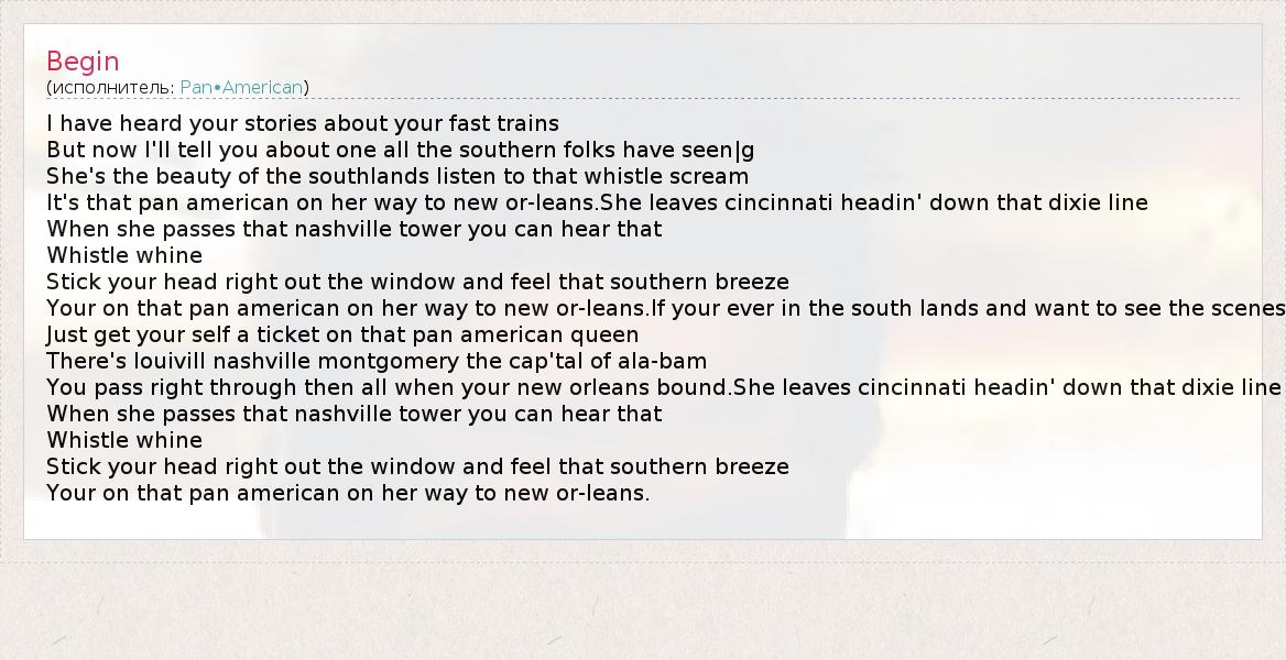 I have heard your stories about your fast trains But now I'll tell you about one all the southern folks have seen|g She's the beauty of the southlands listen to that whistle scream It's that pan american on her way to new or-leans.She leaves cincinnati headin' down that dixie line When she passes that nashville tower you can hear that Whistle whine Stick your head right out the window and feel that southern breeze Your on that pan american on her way to new or-leans.If your ever in the south lands and want to see the scenes Just get your self a ticket on that pan american queen There's louivill nashville montgomery the cap'tal of ala-bam You pass right through then all when your new orleans bound.She leaves cincinnati headin' down that dixie line When she passes that nashville tower you can hear that Whistle whine Stick your head right out the window and feel that southern breeze Your on that pan american on her way to new or-leans.