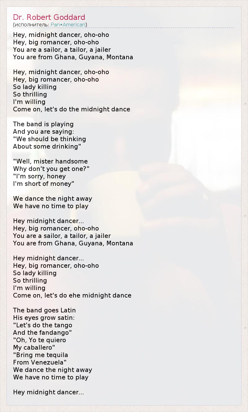 Эй, полуночный танцор, Эй, великий фантазер, Ты - моряк, портной, тюремщик. Ты из Ганы, Гайаны, Монтаны. Эй, полуночный танцор, Эй, великий фантазер, Такой сердцеед, Такой волнующий. Я согласна, Давай станцуем полуночный танец. Музыканты играют, И ты говоришь: "Надо бы нам позаботиться О выпивке." "Ну, мистер Красавчик, Почему бы тебе не заказать бутылочку?" "Прости, душечка, У меня не хватает денег." Мы танцуем всю ночь напролет, У нас нет времени на игры. Эй, полуночный танцор, Эй, великий фантазер, Ты - моряк, портной, тюремщик. Ты из Ганы, Гайаны, Монтаны. Эй, полуночный танцор, Эй, великий фантазер, Такой сердцеед, Такой волнующий. Я согласна, Давай станцуем полуночный танец. Музыканты начинают играть латино, Его взгляд загорается: "Давай станцуем танго И фанданго." "О, я люблю тебя, Мой рыцарь." "Принеси мне Венесуэльской Текилы." Мы танцуем всю ночь напролет, У нас нет времени на игры. Эй, полуночный танцор...