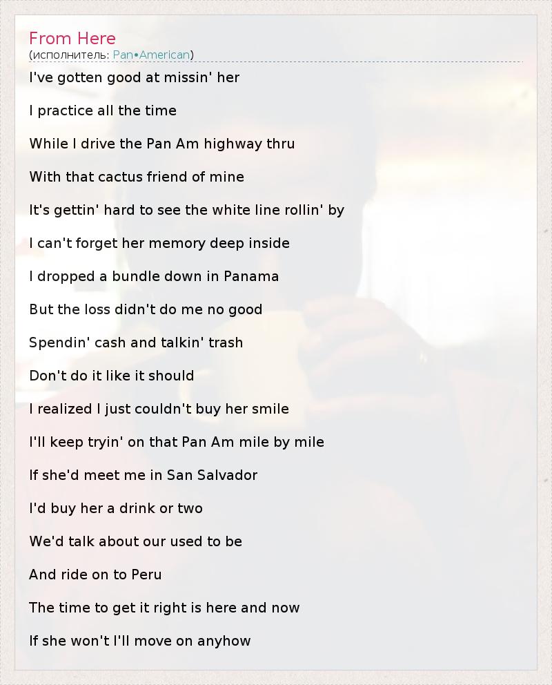 I've gotten good at missin' her I practice all the time While I drive the Pan Am highway thru With that cactus friend of mine It's gettin' hard to see the white line rollin' by I can't forget her memory deep inside I dropped a bundle down in Panama But the loss didn't do me no good Spendin' cash and talkin' trash Don't do it like it should I realized I just couldn't buy her smile I'll keep tryin' on that Pan Am mile by mile If she'd meet me in San Salvador I'd buy her a drink or two We'd talk about our used to be And ride on to Peru The time to get it right is here and now If she won't I'll move on anyhow