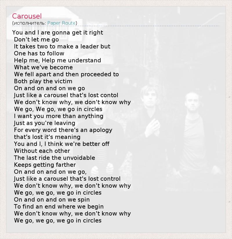 You and I are gonna get it right Don't let me go It takes two to make a leader but One has to follow Help me, Help me understand What we've become We fell apart and then proceeded to Both play the victim On and on and on we go Just like a carousel that's lost contol We don't know why, we don't know why We go, We go, we go in circles I want you more than anything Just as you're leaving For every word there's an apology that's lost it's meaning You and I, I think we're better off Without each other The last ride the unvoidable Keeps getting farther On and on and on we go, Just like a carousel that's lost control We don't know why, we don't know why We go, we go, we go in circles On and on and on we spin To find an end where we begin We don't know why, we don't know why We go, we go, we go in circles