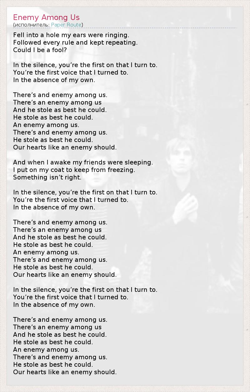 Fell into a hole my ears were ringing. Followed every rule and kept repeating. Could I be a fool? In the silence, you’re the first on that I turn to. You’re the first voice that I turned to. In the absence of my own. There’s and enemy among us. There’s an enemy among us And he stole as best he could. He stole as best he could. An enemy among us. There’s and enemy among us. He stole as best he could. Our hearts like an enemy should. And when I awake my friends were sleeping. I put on my coat to keep from freezing. Something isn’t right. In the silence, you’re the first on that I turn to. You’re the first voice that I turned to. In the absence of my own. There’s and enemy among us. There’s an enemy among us And he stole as best he could. He stole as best he could. An enemy among us. There’s and enemy among us. He stole as best he could. Our hearts like an enemy should. In the silence, you’re the first on that I turn to. You’re the first voice that I turned to. In the absence of my own. There’s and enemy among us. There’s an enemy among us And he stole as best he could. He stole as best he could. An enemy among us. There’s and enemy among us. He stole as best he could. Our hearts like an enemy should.