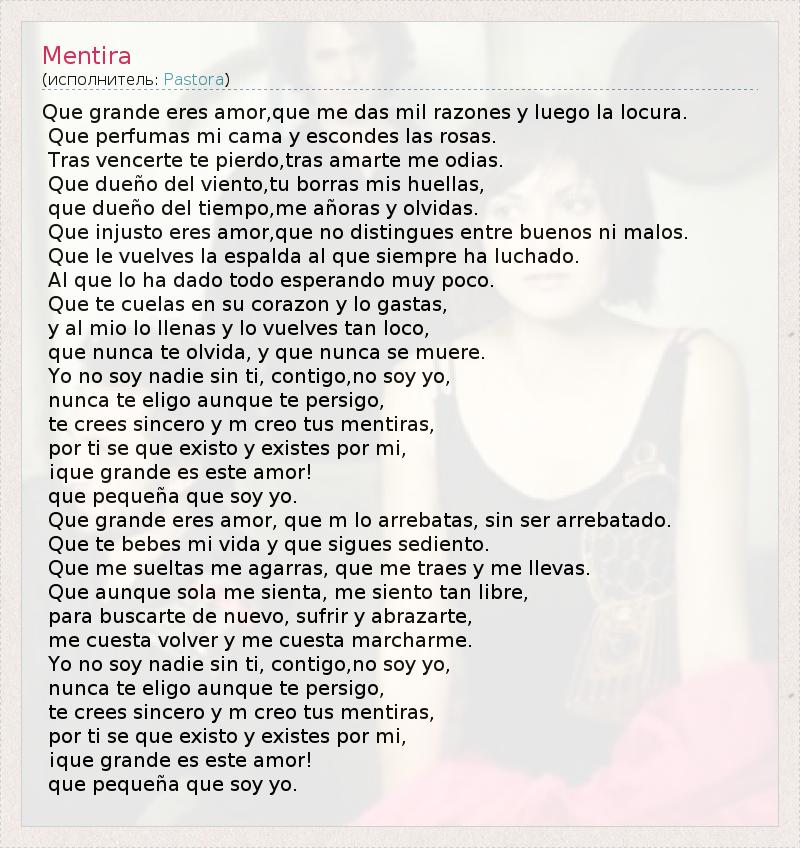 Que grande eres amor,que me das mil razones y luego la locura. Que perfumas mi cama y escondes las rosas. Tras vencerte te pierdo,tras amarte me odias. Que dueño del viento,tu borras mis huellas, que dueño del tiempo,me añoras y olvidas. Que injusto eres amor,que no distingues entre buenos ni malos. Que le vuelves la espalda al que siempre ha luchado. Al que lo ha dado todo esperando muy poco. Que te cuelas en su corazon y lo gastas, y al mio lo llenas y lo vuelves tan loco, que nunca te olvida, y que nunca se muere. Yo no soy nadie sin ti, contigo,no soy yo, nunca te eligo aunque te persigo, te crees sincero y m creo tus mentiras, por ti se que existo y existes por mi, ¡que grande es este amor! que pequeña que soy yo. Que grande eres amor, que m lo arrebatas, sin ser arrebatado. Que te bebes mi vida y que sigues sediento. Que me sueltas me agarras, que me traes y me llevas. Que aunque sola me sienta, me siento tan libre, para buscarte de nuevo, sufrir y abrazarte, me cuesta volver y me cuesta marcharme. Yo no soy nadie sin ti, contigo,no soy yo, nunca te eligo aunque te persigo, te crees sincero y m creo tus mentiras, por ti se que existo y existes por mi, ¡que grande es este amor! que pequeña que soy yo.