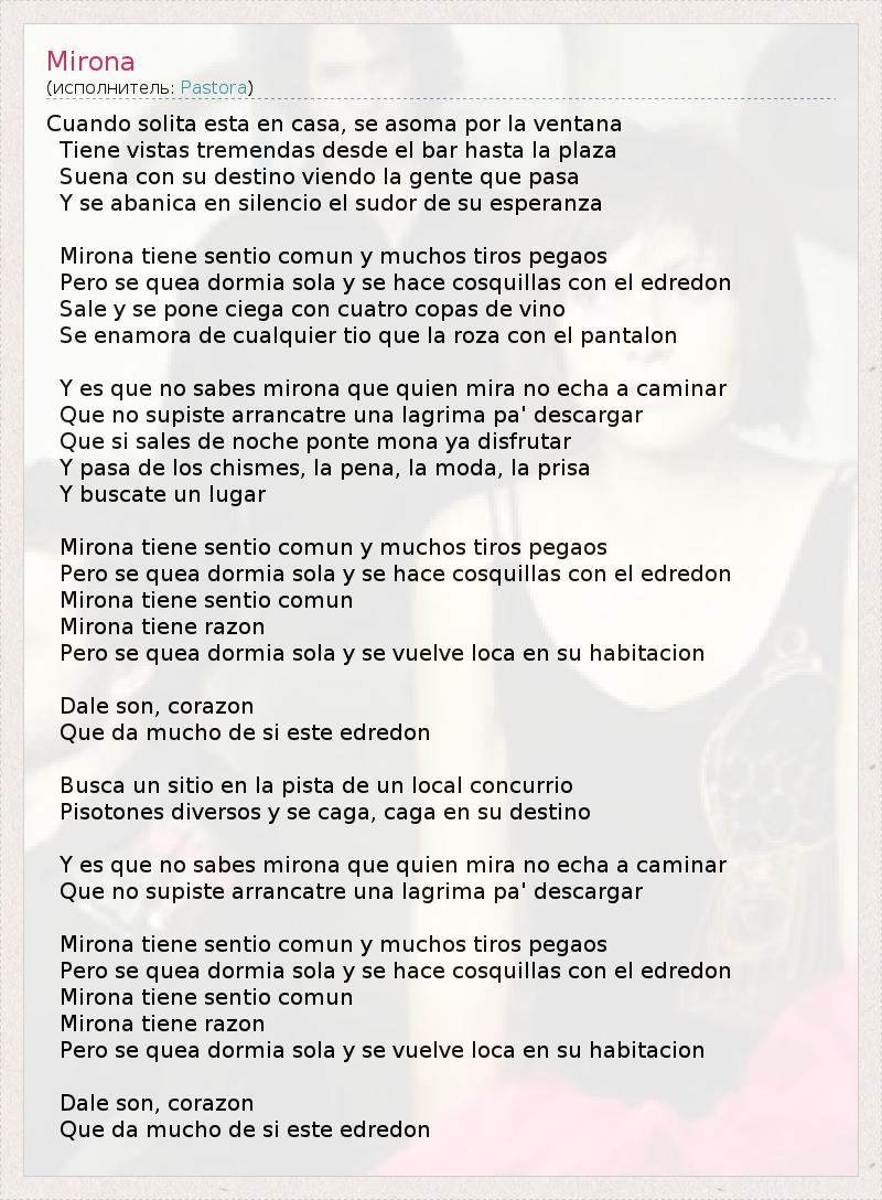 Cuando solita esta en casa, se asoma por la ventana Tiene vistas tremendas desde el bar hasta la plaza Suena con su destino viendo la gente que pasa Y se abanica en silencio el sudor de su esperanza Mirona tiene sentio comun y muchos tiros pegaos Pero se quea dormia sola y se hace cosquillas con el edredon Sale y se pone ciega con cuatro copas de vino Se enamora de cualquier tio que la roza con el pantalon Y es que no sabes mirona que quien mira no echa a caminar Que no supiste arrancatre una lagrima pa' descargar Que si sales de noche ponte mona ya disfrutar Y pasa de los chismes, la pena, la moda, la prisa Y buscate un lugar Mirona tiene sentio comun y muchos tiros pegaos Pero se quea dormia sola y se hace cosquillas con el edredon Mirona tiene sentio comun Mirona tiene razon Pero se quea dormia sola y se vuelve loca en su habitacion Dale son, corazon Que da mucho de si este edredon Busca un sitio en la pista de un local concurrio Pisotones diversos y se caga, caga en su destino Y es que no sabes mirona que quien mira no echa a caminar Que no supiste arrancatre una lagrima pa' descargar Mirona tiene sentio comun y muchos tiros pegaos Pero se quea dormia sola y se hace cosquillas con el edredon Mirona tiene sentio comun Mirona tiene razon Pero se quea dormia sola y se vuelve loca en su habitacion Dale son, corazon Que da mucho de si este edredon