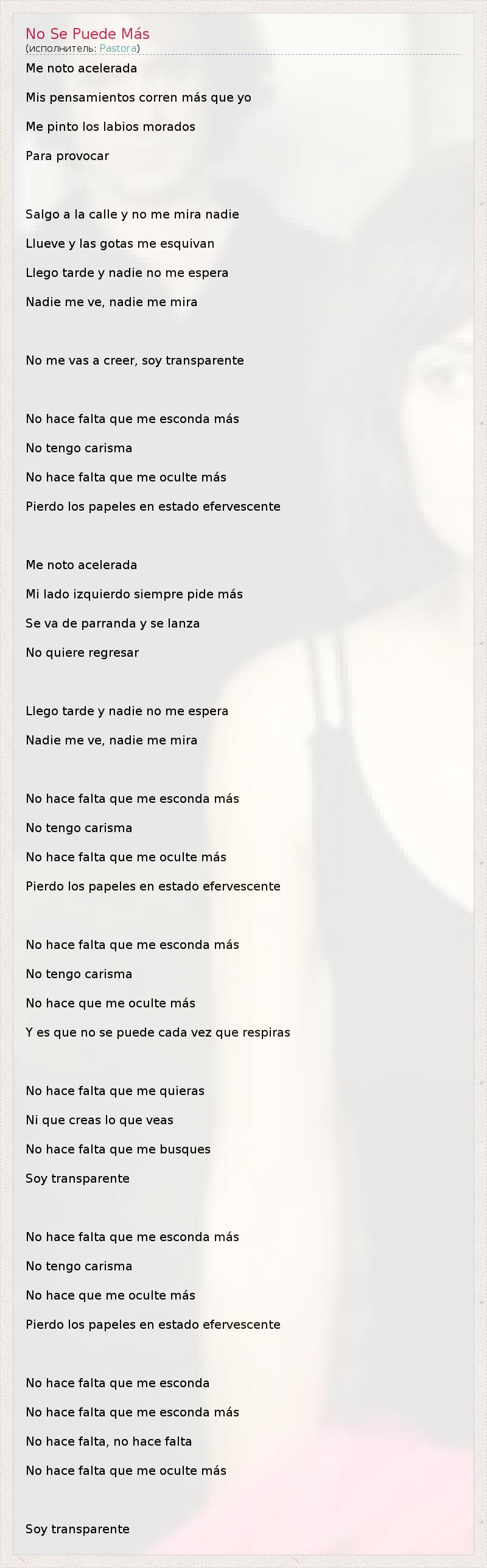 Me noto acelerada Mis pensamientos corren más que yo Me pinto los labios morados Para provocar Salgo a la calle y no me mira nadie Llueve y las gotas me esquivan Llego tarde y nadie no me espera Nadie me ve, nadie me mira No me vas a creer, soy transparente No hace falta que me esconda más No tengo carisma No hace falta que me oculte más Pierdo los papeles en estado efervescente Me noto acelerada Mi lado izquierdo siempre pide más Se va de parranda y se lanza No quiere regresar Llego tarde y nadie no me espera Nadie me ve, nadie me mira No hace falta que me esconda más No tengo carisma No hace falta que me oculte más Pierdo los papeles en estado efervescente No hace falta que me esconda más No tengo carisma No hace que me oculte más Y es que no se puede cada vez que respiras No hace falta que me quieras Ni que creas lo que veas No hace falta que me busques Soy transparente No hace falta que me esconda más No tengo carisma No hace que me oculte más Pierdo los papeles en estado efervescente No hace falta que me esconda No hace falta que me esconda más No hace falta, no hace falta No hace falta que me oculte más Soy transparente