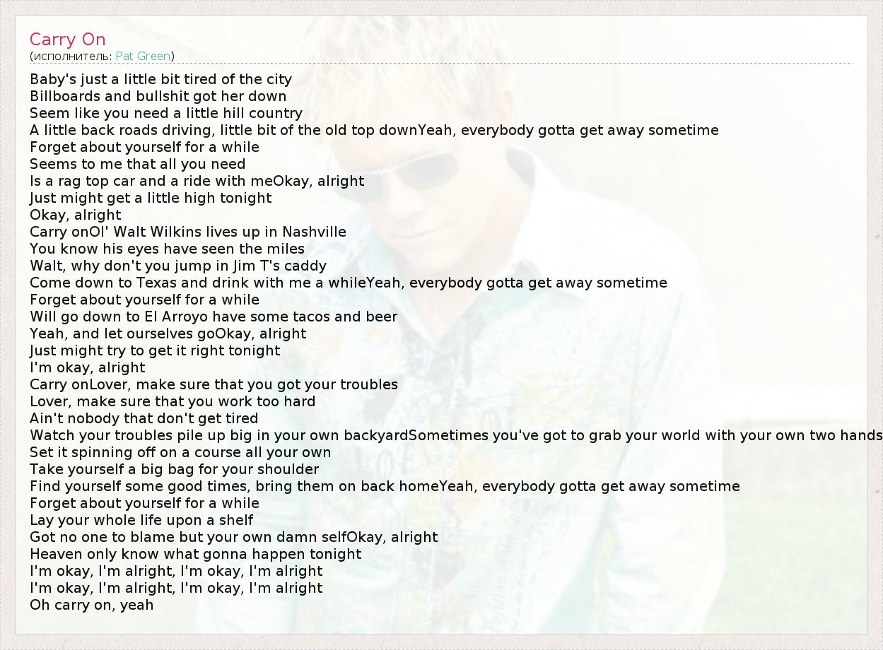 Baby's just a little bit tired of the city Billboards and bullshit got her down Seem like you need a little hill country A little back roads driving, little bit of the old top downYeah, everybody gotta get away sometime Forget about yourself for a while Seems to me that all you need Is a rag top car and a ride with meOkay, alright Just might get a little high tonight Okay, alright Carry onOl' Walt Wilkins lives up in Nashville You know his eyes have seen the miles Walt, why don't you jump in Jim T's caddy Come down to Texas and drink with me a whileYeah, everybody gotta get away sometime Forget about yourself for a while Will go down to El Arroyo have some tacos and beer Yeah, and let ourselves goOkay, alright Just might try to get it right tonight I'm okay, alright Carry onLover, make sure that you got your troubles Lover, make sure that you work too hard Ain't nobody that don't get tired Watch your troubles pile up big in your own backyardSometimes you've got to grab your world with your own two hands Set it spinning off on a course all your own Take yourself a big bag for your shoulder Find yourself some good times, bring them on back homeYeah, everybody gotta get away sometime Forget about yourself for a while Lay your whole life upon a shelf Got no one to blame but your own damn selfOkay, alright Heaven only know what gonna happen tonight I'm okay, I'm alright, I'm okay, I'm alright I'm okay, I'm alright, I'm okay, I'm alright Oh carry on, yeah