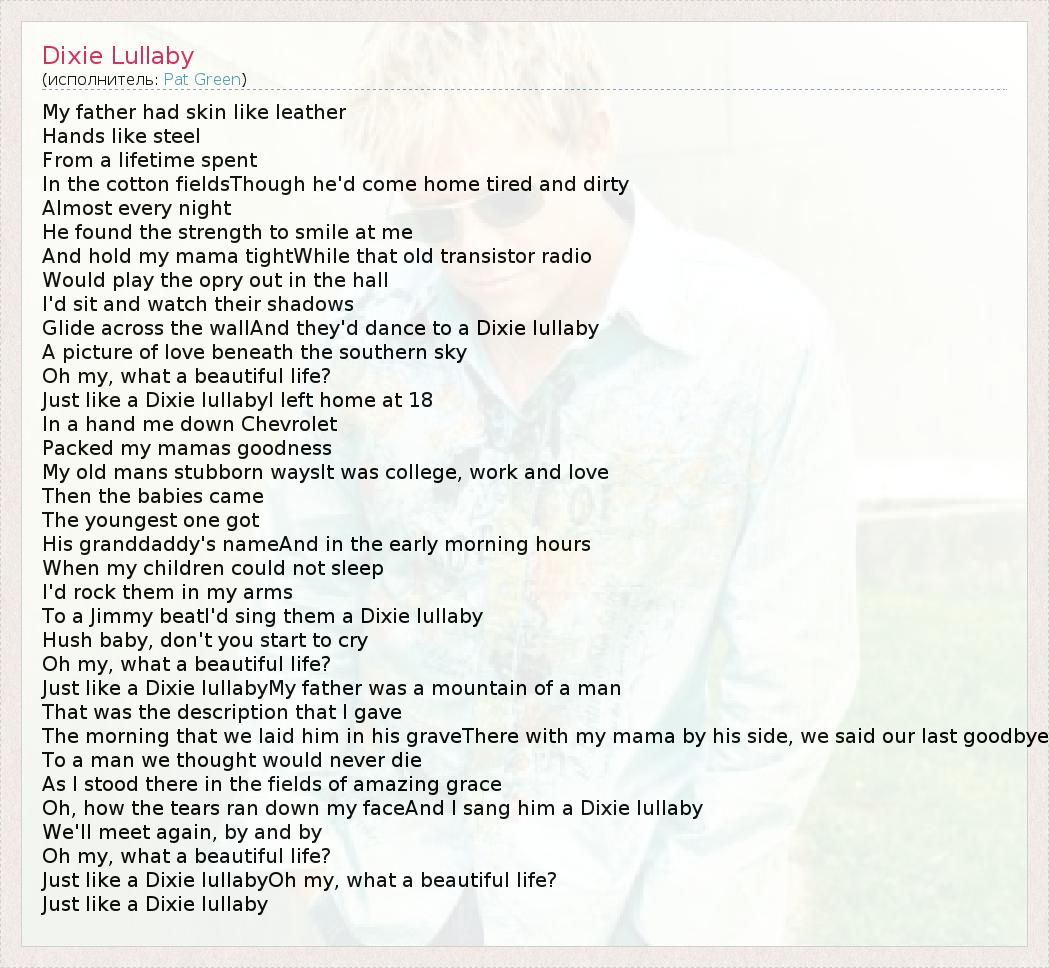 My father had skin like leather Hands like steel From a lifetime spent In the cotton fieldsThough he'd come home tired and dirty Almost every night He found the strength to smile at me And hold my mama tightWhile that old transistor radio Would play the opry out in the hall I'd sit and watch their shadows Glide across the wallAnd they'd dance to a Dixie lullaby A picture of love beneath the southern sky Oh my, what a beautiful life? Just like a Dixie lullabyI left home at 18 In a hand me down Chevrolet Packed my mamas goodness My old mans stubborn waysIt was college, work and love Then the babies came The youngest one got His granddaddy's nameAnd in the early morning hours When my children could not sleep I'd rock them in my arms To a Jimmy beatI'd sing them a Dixie lullaby Hush baby, don't you start to cry Oh my, what a beautiful life? Just like a Dixie lullabyMy father was a mountain of a man That was the description that I gave The morning that we laid him in his graveThere with my mama by his side, we said our last goodbye To a man we thought would never die As I stood there in the fields of amazing grace Oh, how the tears ran down my faceAnd I sang him a Dixie lullaby We'll meet again, by and by Oh my, what a beautiful life? Just like a Dixie lullabyOh my, what a beautiful life? Just like a Dixie lullaby