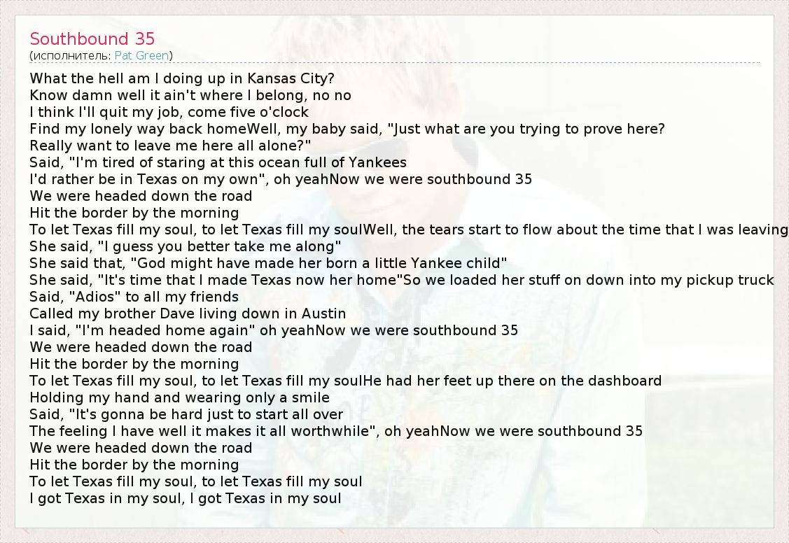 What the hell am I doing up in Kansas City? Know damn well it ain't where I belong, no no I think I'll quit my job, come five o'clock Find my lonely way back homeWell, my baby said, "Just what are you trying to prove here? Really want to leave me here all alone?" Said, "I'm tired of staring at this ocean full of Yankees I'd rather be in Texas on my own", oh yeahNow we were southbound 35 We were headed down the road Hit the border by the morning To let Texas fill my soul, to let Texas fill my soulWell, the tears start to flow about the time that I was leaving She said, "I guess you better take me along" She said that, "God might have made her born a little Yankee child" She said, "It's time that I made Texas now her home"So we loaded her stuff on down into my pickup truck Said, "Adios" to all my friends Called my brother Dave living down in Austin I said, "I'm headed home again" oh yeahNow we were southbound 35 We were headed down the road Hit the border by the morning To let Texas fill my soul, to let Texas fill my soulHe had her feet up there on the dashboard Holding my hand and wearing only a smile Said, "It's gonna be hard just to start all over The feeling I have well it makes it all worthwhile", oh yeahNow we were southbound 35 We were headed down the road Hit the border by the morning To let Texas fill my soul, to let Texas fill my soul I got Texas in my soul, I got Texas in my soul