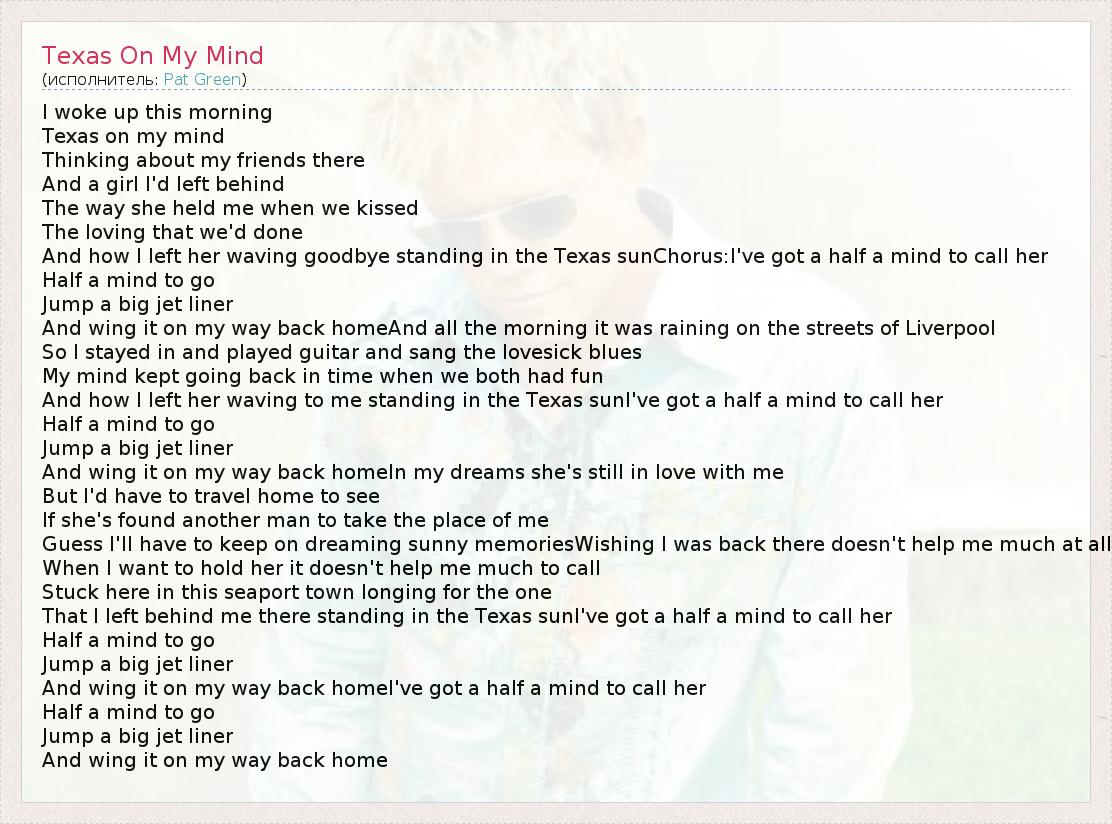 А как ты думаешь, о чем песня "Texas On My Mind" ?