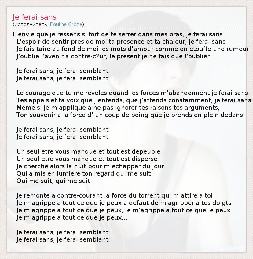 L'envie que je ressens si fort de te serrer dans mes bras, je ferai sans L'espoir de sentir pres de moi ta presence et ta chaleur, je ferai sans Je fais taire au fond de moi les mots d'amour comme on etouffe une rumeur J'oublie l'avenir a contre-c?ur, le present je ne fais que l'oublier Je ferai sans, je ferai semblant Je ferai sans, je ferai semblant Le courage que tu me reveles quand les forces m'abandonnent je ferai sans Tes appels et ta voix que j'entends, que j'attends constamment, je ferai sans Meme si je m'applique a ne pas ignorer tes raisons tes arguments, Ton souvenir a la force d' un coup de poing que je prends en plein dedans. Je ferai sans, je ferai semblant Je ferai sans, je ferai semblant Un seul etre vous manque et tout est depeuple Un seul etre vous manque et tout est disperse Je cherche alors la nuit pour m'echapper du jour Qui a mis en lumiere ton regard qui me suit Qui me suit, qui me suit Je remonte a contre-courant la force du torrent qui m'attire a toi Je m'agrippe a tout ce que je peux a defaut de m'agripper a tes doigts Je m'agrippe a tout ce que je peux, je m'agrippe a tout ce que je peux Je m'agrippe a tout ce que je peux… Je ferai sans, je ferai semblant Je ferai sans, je ferai semblant