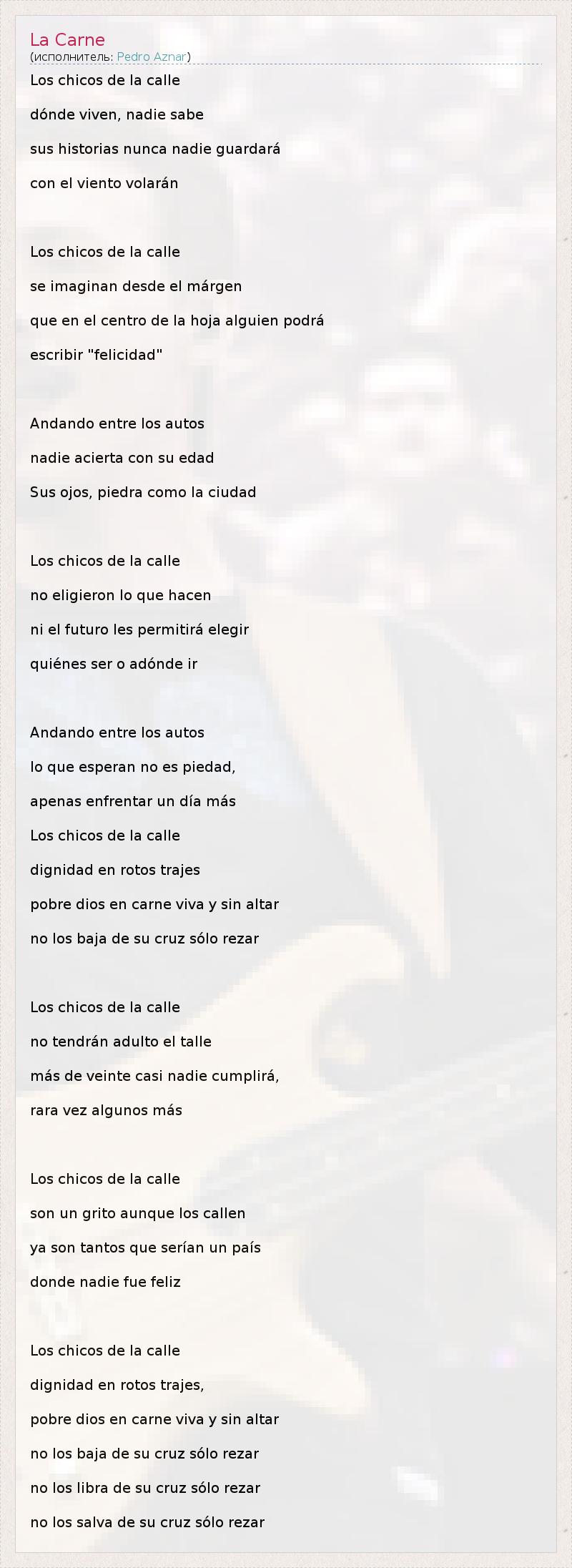 Los chicos de la calle dónde viven, nadie sabe sus historias nunca nadie guardará con el viento volarán Los chicos de la calle se imaginan desde el márgen que en el centro de la hoja alguien podrá escribir "felicidad" Andando entre los autos nadie acierta con su edad Sus ojos, piedra como la ciudad Los chicos de la calle no eligieron lo que hacen ni el futuro les permitirá elegir quiénes ser o adónde ir Andando entre los autos lo que esperan no es piedad, apenas enfrentar un día más Los chicos de la calle dignidad en rotos trajes pobre dios en carne viva y sin altar no los baja de su cruz sólo rezar Los chicos de la calle no tendrán adulto el talle más de veinte casi nadie cumplirá, rara vez algunos más Los chicos de la calle son un grito aunque los callen ya son tantos que serían un país donde nadie fue feliz Los chicos de la calle dignidad en rotos trajes, pobre dios en carne viva y sin altar no los baja de su cruz sólo rezar no los libra de su cruz sólo rezar no los salva de su cruz sólo rezar