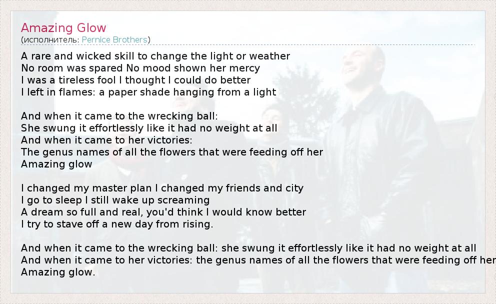 A rare and wicked skill to change the light or weather No room was spared No mood shown her mercy I was a tireless fool I thought I could do better I left in flames: a paper shade hanging from a light And when it came to the wrecking ball: She swung it effortlessly like it had no weight at all And when it came to her victories: The genus names of all the flowers that were feeding off her Amazing glow I changed my master plan I changed my friends and city I go to sleep I still wake up screaming A dream so full and real, you'd think I would know better I try to stave off a new day from rising. And when it came to the wrecking ball: she swung it effortlessly like it had no weight at all And when it came to her victories: the genus names of all the flowers that were feeding off her Amazing glow.