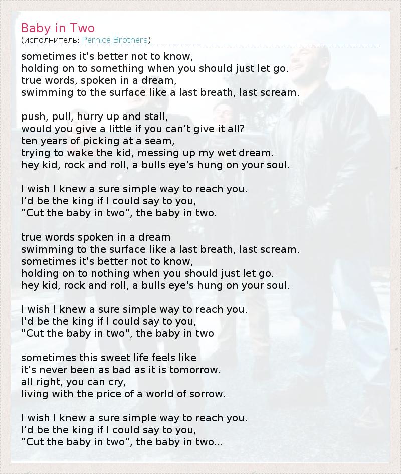sometimes it's better not to know, holding on to something when you should just let go. true words, spoken in a dream, swimming to the surface like a last breath, last scream. push, pull, hurry up and stall, would you give a little if you can't give it all? ten years of picking at a seam, trying to wake the kid, messing up my wet dream. hey kid, rock and roll, a bulls eye's hung on your soul. I wish I knew a sure simple way to reach you. I'd be the king if I could say to you, "Cut the baby in two", the baby in two. true words spoken in a dream swimming to the surface like a last breath, last scream. sometimes it's better not to know, holding on to nothing when you should just let go. hey kid, rock and roll, a bulls eye's hung on your soul. I wish I knew a sure simple way to reach you. I'd be the king if I could say to you, "Cut the baby in two", the baby in two sometimes this sweet life feels like it's never been as bad as it is tomorrow. all right, you can cry, living with the price of a world of sorrow. I wish I knew a sure simple way to reach you. I'd be the king if I could say to you, "Cut the baby in two", the baby in two...