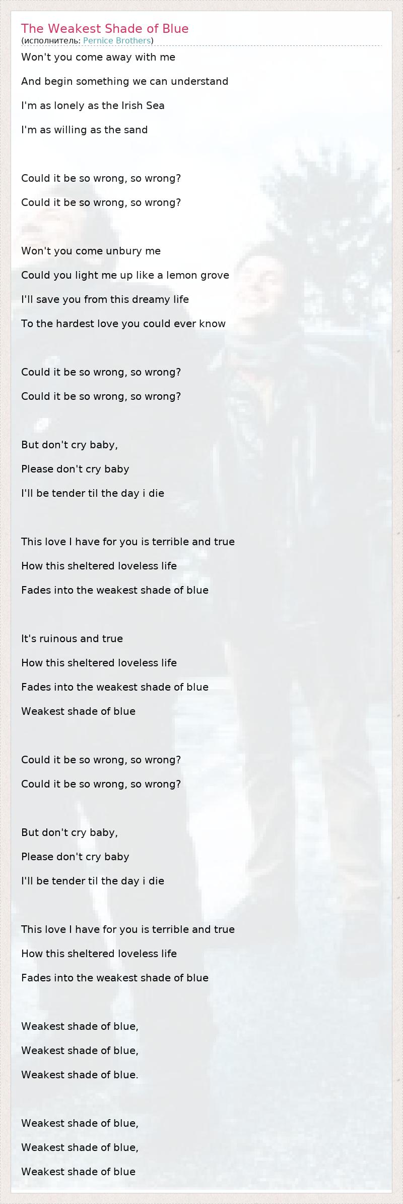 Won't you come away with me And begin something we can understand I'm as lonely as the Irish Sea I'm as willing as the sand Could it be so wrong, so wrong? Could it be so wrong, so wrong? Won't you come unbury me Could you light me up like a lemon grove I'll save you from this dreamy life To the hardest love you could ever know Could it be so wrong, so wrong? Could it be so wrong, so wrong? But don't cry baby, Please don't cry baby I'll be tender til the day i die This love I have for you is terrible and true How this sheltered loveless life Fades into the weakest shade of blue It's ruinous and true How this sheltered loveless life Fades into the weakest shade of blue Weakest shade of blue Could it be so wrong, so wrong? Could it be so wrong, so wrong? But don't cry baby, Please don't cry baby I'll be tender til the day i die This love I have for you is terrible and true How this sheltered loveless life Fades into the weakest shade of blue Weakest shade of blue, Weakest shade of blue, Weakest shade of blue. Weakest shade of blue, Weakest shade of blue, Weakest shade of blue