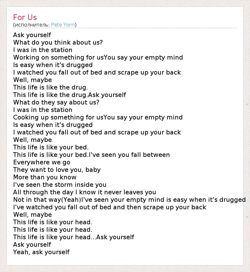 Ask yourself What do you think about us? I was in the station Working on something for usYou say your empty mind Is easy when it's drugged I watched you fall out of bed and scrape up your back Well, maybe This life is like the drug. This life is like the drug.Ask yourself What do they say about us? I was in the station Cooking up something for usYou say your empty mind Is easy when it's drugged I watched you fall out of bed and scrape up your back Well, maybe This life is like your bed. This life is like your bed.I've seen you fall between Everywhere we go They want to love you, baby More than you know I've seen the storm inside you All through the day I know it never leaves you Not in that way(Yeah)I've seen your empty mind is easy when it's drugged I've watched you fall out of bed and then scrape up your back Well, maybe This life is like your head. This life is like your head. This life is like your head...Ask yourself Ask yourself Yeah, ask yourself