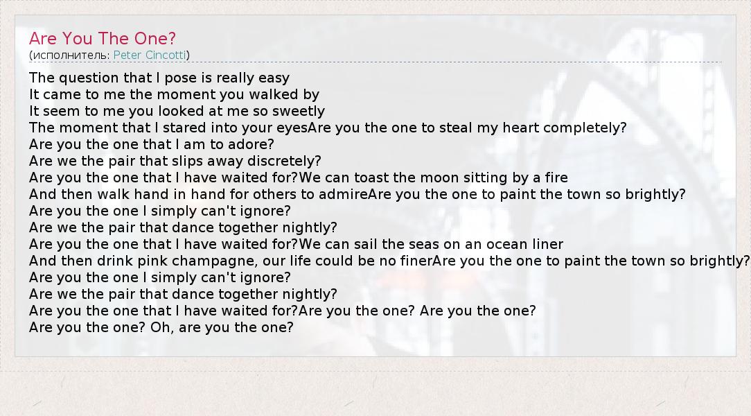 The question that I pose is really easy It came to me the moment you walked by It seem to me you looked at me so sweetly The moment that I stared into your eyesAre you the one to steal my heart completely? Are you the one that I am to adore? Are we the pair that slips away discretely? Are you the one that I have waited for?We can toast the moon sitting by a fire And then walk hand in hand for others to admireAre you the one to paint the town so brightly? Are you the one I simply can't ignore? Are we the pair that dance together nightly? Are you the one that I have waited for?We can sail the seas on an ocean liner And then drink pink champagne, our life could be no finerAre you the one to paint the town so brightly? Are you the one I simply can't ignore? Are we the pair that dance together nightly? Are you the one that I have waited for?Are you the one? Are you the one? Are you the one? Oh, are you the one?