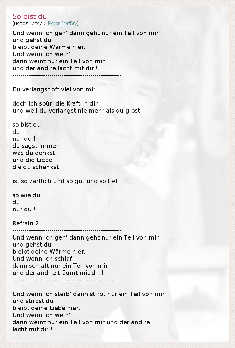 Und wenn ich geh' dann geht nur ein Teil von mir und gehst du bleibt deine Wärme hier. Und wenn ich wein' dann weint nur ein Teil von mir und der and're lacht mit dir ! ----------------------------------------------------- Du verlangst oft viel von mir doch ich spür' die Kraft in dir und weil du verlangst nie mehr als du gibst so bist du du nur du ! du sagst immer was du denkst und die Liebe die du schenkst ist so zärtlich und so gut und so tief so wie du du nur du ! Refrain 2: ----------------------------------------------------- Und wenn ich geh' dann geht nur ein Teil von mir und gehst du bleibt deine Wärme hier. Und wenn ich schlaf' dann schläft nur ein Teil von mir und der and're träumt mit dir ! ----------------------------------------------------- Und wenn ich sterb' dann stirbt nur ein Teil von mir und stirbst du bleibt deine Liebe hier. Und wenn ich wein' dann weint nur ein Teil von mir und der and're lacht mit dir !