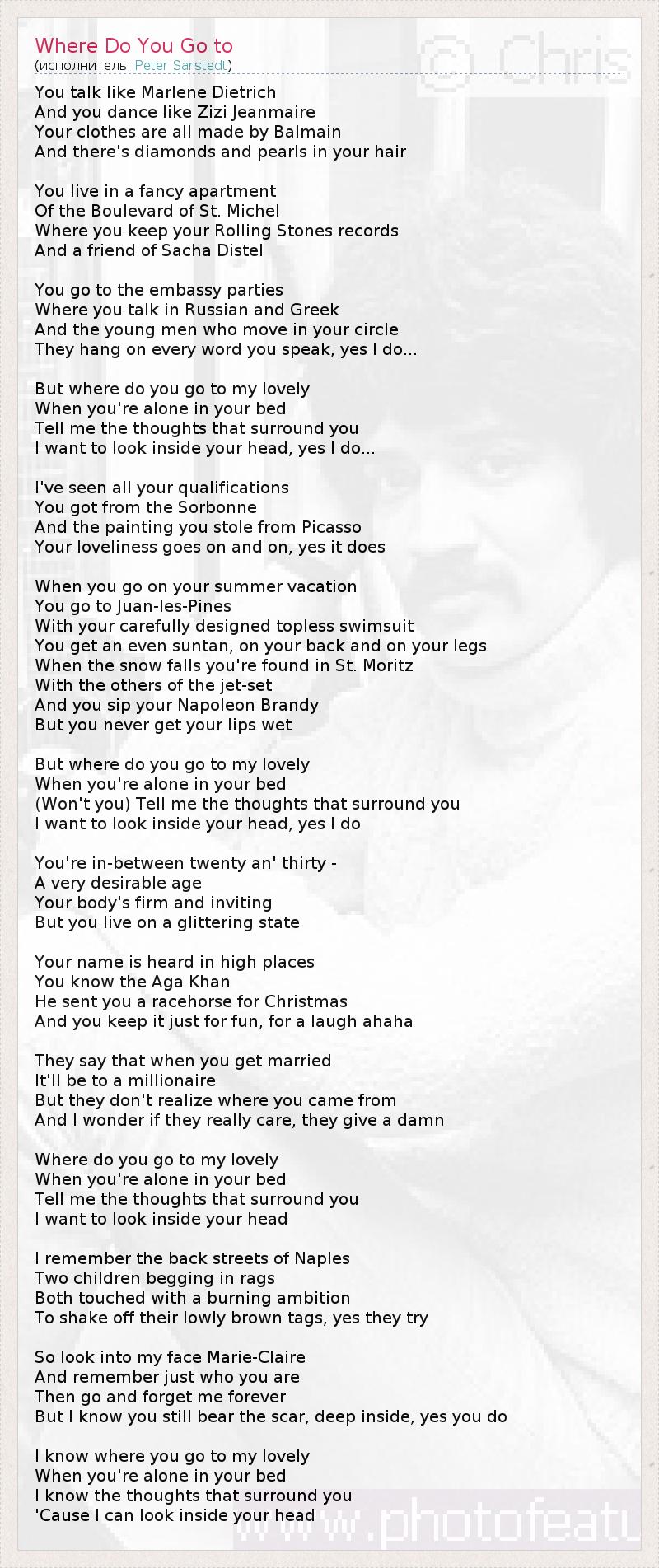 You talk like Marlene Dietrich And you dance like Zizi Jeanmaire Your clothes are all made by Balmain And there's diamonds and pearls in your hair You live in a fancy apartment Of the Boulevard of St. Michel Where you keep your Rolling Stones records And a friend of Sacha Distel You go to the embassy parties Where you talk in Russian and Greek And the young men who move in your circle They hang on every word you speak, yes I do... But where do you go to my lovely When you're alone in your bed Tell me the thoughts that surround you I want to look inside your head, yes I do... I've seen all your qualifications You got from the Sorbonne And the painting you stole from Picasso Your loveliness goes on and on, yes it does When you go on your summer vacation You go to Juan-les-Pines With your carefully designed topless swimsuit You get an even suntan, on your back and on your legs When the snow falls you're found in St. Moritz With the others of the jet-set And you sip your Napoleon Brandy But you never get your lips wet But where do you go to my lovely When you're alone in your bed (Won't you) Tell me the thoughts that surround you I want to look inside your head, yes I do You're in-between twenty an' thirty - A very desirable age Your body's firm and inviting But you live on a glittering state Your name is heard in high places You know the Aga Khan He sent you a racehorse for Christmas And you keep it just for fun, for a laugh ahaha They say that when you get married It'll be to a millionaire But they don't realize where you came from And I wonder if they really care, they give a damn Where do you go to my lovely When you're alone in your bed Tell me the thoughts that surround you I want to look inside your head I remember the back streets of Naples Two children begging in rags Both touched with a burning ambition To shake off their lowly brown tags, yes they try So look into my face Marie-Claire And remember just who you are Then go and forget me forever But I know you still bear the scar, deep inside, yes you do I know where you go to my lovely When you're alone in your bed I know the thoughts that surround you 'Cause I can look inside your head