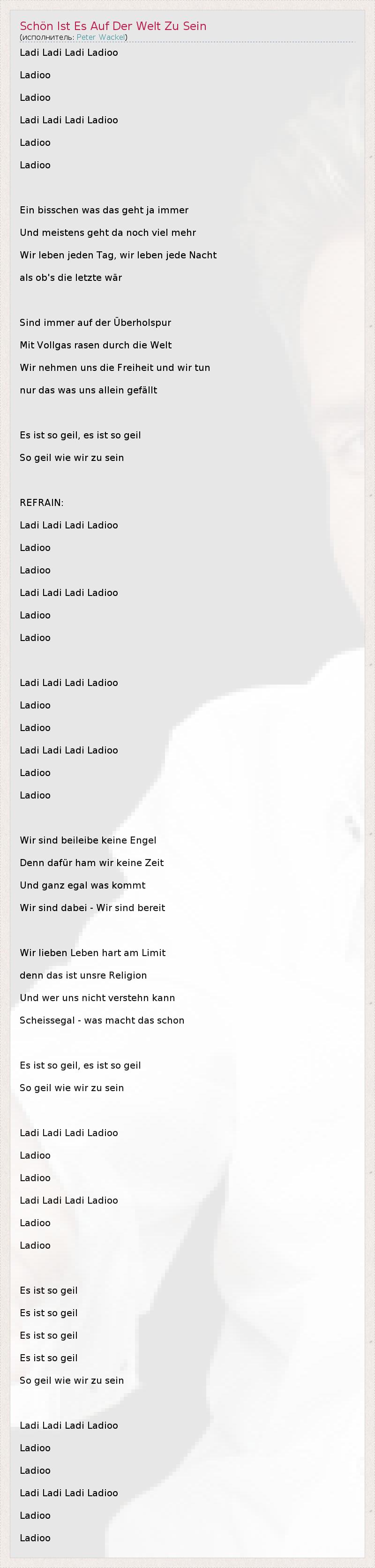 Ladi Ladi Ladi Ladioo Ladioo Ladioo Ladi Ladi Ladi Ladioo Ladioo Ladioo Ein bisschen was das geht ja immer Und meistens geht da noch viel mehr Wir leben jeden Tag, wir leben jede Nacht als ob's die letzte wär Sind immer auf der Überholspur Mit Vollgas rasen durch die Welt Wir nehmen uns die Freiheit und wir tun nur das was uns allein gefällt Es ist so geil, es ist so geil So geil wie wir zu sein REFRAIN: Ladi Ladi Ladi Ladioo Ladioo Ladioo Ladi Ladi Ladi Ladioo Ladioo Ladioo Ladi Ladi Ladi Ladioo Ladioo Ladioo Ladi Ladi Ladi Ladioo Ladioo Ladioo Wir sind beileibe keine Engel Denn dafür ham wir keine Zeit Und ganz egal was kommt Wir sind dabei - Wir sind bereit Wir lieben Leben hart am Limit denn das ist unsre Religion Und wer uns nicht verstehn kann Scheissegal - was macht das schon Es ist so geil, es ist so geil So geil wie wir zu sein Ladi Ladi Ladi Ladioo Ladioo Ladioo Ladi Ladi Ladi Ladioo Ladioo Ladioo Es ist so geil Es ist so geil Es ist so geil Es ist so geil So geil wie wir zu sein Ladi Ladi Ladi Ladioo Ladioo Ladioo Ladi Ladi Ladi Ladioo Ladioo Ladioo