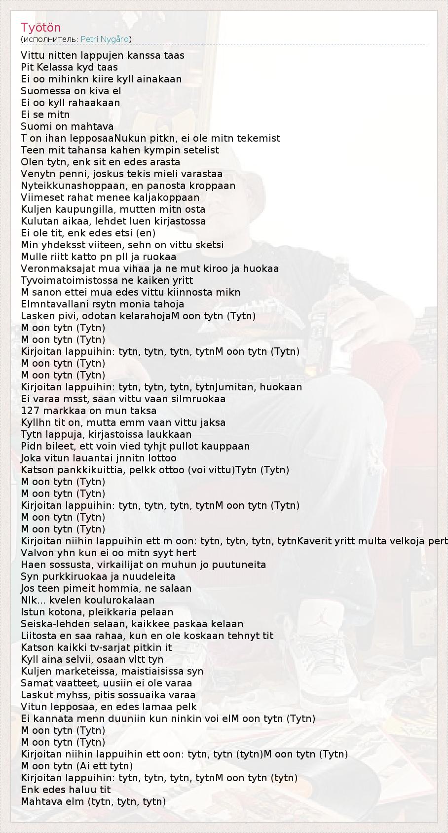 Это интересно:Petri Nygård - один из первых финских рэп-исполнителей, прославившийся во всемирной паутине и признанный за рубежом: в США, Финляндии и Швеции.Его первая пластинка "Pillumagneetti" была выпущена весной 2000 года в качестве бесплатного релиза. После более чем 30000 скачиваний в месяц его звукозаписывающая компания Open Records заключила союз с Poko Rekords, чтобы выпускать... продолжение