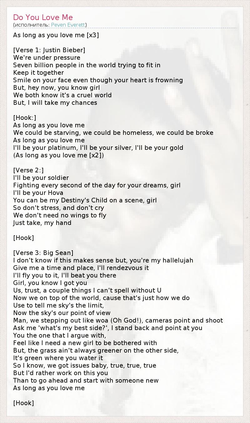 Пока ты меня любишь [x3] [Джастин Бибер:] На нас давят со всех сторон. Семь миллиардов людей пытаются найти свое место в мире. Главное – держаться вместе. Ты улыбаешься, хотя на душе кошки скребут. Но, эй, девчонка, Мы оба знаем, что этот мир жесток, Но я все же рискну... [Припев:] Пока ты меня любишь, Мы можем голодать, мы можем жить на улице, мы можем быть на мели. Пока ты меня любишь, Я буду твоей платиной, твоим серебром, твоим золотом. Пока ты меня любишь [x2] [Джастин Бибер:] Я буду твоим солдатом, Буду бороться за твои мечты каждую секунду, малышка. Я буду твоим Богом, как Jay-Z 1 А ты будешь моей Бейонсе на сцене, детка 2 Так что не волнуйся и не плачь. Нам не нужны крылья для того, чтобы летать, - Просто возьми меня за руку. [Припев] [Big Sean:] Не знаю, есть ли смысл в этих словах, но ты - моё аллилуйя! Дай мне время и место, и я устрою рандеву. Мы прилетим туда, ты будешь ошеломлена. Малышка, ты же знаешь, что ты моя. НАСтоящего нет без НАС; а МЫ нужны, чтобы был сМЫсл. 3 Мы на вершине мира, детка, иначе мы просто не можем. Ты любила повторять, что предел – только небо, Теперь мы на вершине неба. Боже, мы идем такие типа... (О, Боже!) Вспышки камер нацелены на нас. Попроси меня рассказать о моих достоинствах, - и я расскажу о тебе. Порой мы с тобой спорим, И я думаю, что мне нужна новая девушка. Говорят, "везде хорошо, где нас нет". На самом деле хорошо там, где мы прилагаем все усилия, чтобы было хорошо. Да, я знаю, у нас есть проблемы, малышка, это правда. Но лучше я решу все наши проблемы, Чем начну отношения с новой девушкой До тех пор, пока ты любишь меня. [Припев] 1 - Hova - Хова – имя, которое репер Jay-Z дал самому себе, когда он обращается к себе как к Богу Репа. Jehovah (Иегова) – одно из имен Бога. 2 - Destiny's Child – группа, ведущей певицей которой была Бейонсе. Как только она написала свою первую сольную песню, группа сразу же распалась. Jay-Z и Бейонсе были безумно влюблены друг в друга, о чем поют в своей совместной песне Crazy in Love 3 - Попытка переводчика передать смысл каламбура оригинального текста. Дословный перевод: "Мы, доверие... Некоторые слова не пишутся без тебя" (в англ. словах Us, trUst - есть буква U, частое сокращение местоимения You = ты)