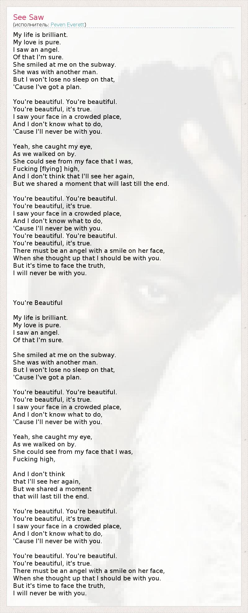 My life is brilliant. My love is pure. I saw an angel. Of that I'm sure. She smiled at me on the subway. She was with another man. But I won't lose no sleep on that, 'Cause I've got a plan. You're beautiful. You're beautiful. You're beautiful, it's true. I saw your face in a crowded place, And I don't know what to do, 'Cause I'll never be with you. Yeah, she caught my eye, As we walked on by. She could see from my face that I was, Fucking [flying] high, And I don't think that I'll see her again, But we shared a moment that will last till the end. You're beautiful. You're beautiful. You're beautiful, it's true. I saw your face in a crowded place, And I don't know what to do, 'Cause I'll never be with you. You're beautiful. You're beautiful. You're beautiful, it's true. There must be an angel with a smile on her face, When she thought up that I should be with you. But it's time to face the truth, I will never be with you. You're Beautiful My life is brilliant. My love is pure. I saw an angel. Of that I'm sure. She smiled at me on the subway. She was with another man. But I won't lose no sleep on that, 'Cause I've got a plan. You're beautiful. You're beautiful. You're beautiful, it's true. I saw your face in a crowded place, And I don't know what to do, 'Cause I'll never be with you. Yeah, she caught my eye, As we walked on by. She could see from my face that I was, Fucking high, And I don't think that I'll see her again, But we shared a moment that will last till the end. You're beautiful. You're beautiful. You're beautiful, it's true. I saw your face in a crowded place, And I don't know what to do, 'Cause I'll never be with you. You're beautiful. You're beautiful. You're beautiful, it's true. There must be an angel with a smile on her face, When she thought up that I should be with you. But it's time to face the truth, I will never be with you.