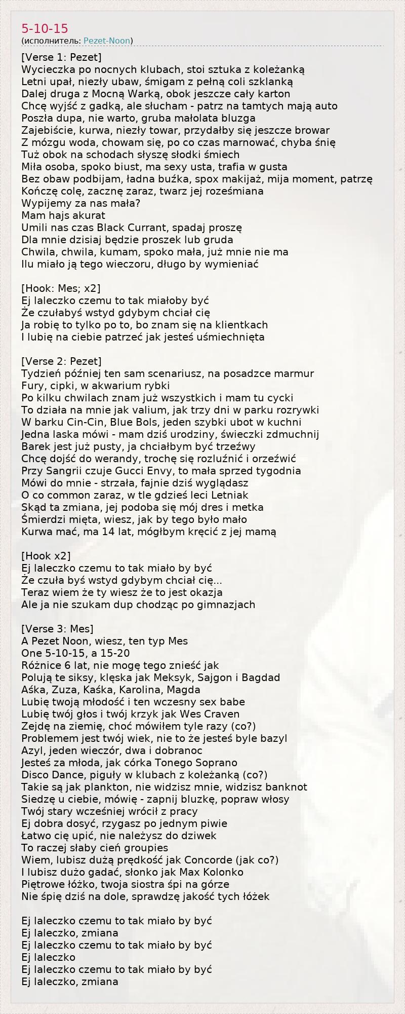[Verse 1: Pezet] Wycieczka po nocnych klubach, stoi sztuka z koleżanką Letni upał, niezły ubaw, śmigam z pełną coli szklanką Dalej druga z Mocną Warką, obok jeszcze cały karton Chcę wyjść z gadką, ale słucham - patrz na tamtych mają auto Poszła dupa, nie warto, gruba małolata bluzga Zajebiście, kurwa, niezły towar, przydałby się jeszcze browar Z mózgu woda, chowam się, po co czas marnować, chyba śnię Tuż obok na schodach słyszę słodki śmiech Miła osoba, spoko biust, ma sexy usta, trafia w gusta Bez obaw podbijam, ładna buźka, spox makijaż, mija moment, patrzę Kończę colę, zacznę zaraz, twarz jej roześmiana Wypijemy za nas mała? Mam hajs akurat Umili nas czas Black Currant, spadaj proszę Dla mnie dzisiaj będzie proszek lub gruda Chwila, chwila, kumam, spoko mała, już mnie nie ma Ilu miało ją tego wieczoru, długo by wymieniać [Hook: Mes; x2] Ej laleczko czemu to tak miałoby być Że czułabyś wstyd gdybym chciał cię Ja robię to tylko po to, bo znam się na klientkach I lubię na ciebie patrzeć jak jesteś uśmiechnięta [Verse 2: Pezet] Tydzień później ten sam scenariusz, na posadzce marmur Fury, cipki, w akwarium rybki Po kilku chwilach znam już wszystkich i mam tu cycki To działa na mnie jak valium, jak trzy dni w parku rozrywki W barku Cin-Cin, Blue Bols, jeden szybki ubot w kuchni Jedna laska mówi - mam dziś urodziny, świeczki zdmuchnij Barek jest już pusty, ja chciałbym być trzeźwy Chcę dojść do werandy, trochę się rozluźnić i orzeźwić Przy Sangrii czuje Gucci Envy, to mała sprzed tygodnia Mówi do mnie - strzała, fajnie dziś wyglądasz O co common zaraz, w tle gdzieś leci Letniak Skąd ta zmiana, jej podoba się mój dres i metka Śmierdzi mięta, wiesz, jak by tego było mało Kurwa mać, ma 14 lat, mógłbym kręcić z jej mamą [Hook x2] Ej laleczko czemu to tak miało by być Że czuła byś wstyd gdybym chciał cię... Teraz wiem że ty wiesz że to jest okazja Ale ja nie szukam dup chodząc po gimnazjach [Verse 3: Mes] A Pezet Noon, wiesz, ten typ Mes One 5-10-15, a 15-20 Różnice 6 lat, nie mogę tego znieść jak Polują te siksy, klęska jak Meksyk, Sajgon i Bagdad Aśka, Zuza, Kaśka, Karolina, Magda Lubię twoją młodość i ten wczesny sex babe Lubię twój głos i twój krzyk jak Wes Craven Zejdę na ziemię, choć mówiłem tyle razy (co?) Problemem jest twój wiek, nie to że jesteś byle bazyl Azyl, jeden wieczór, dwa i dobranoc Jesteś za młoda, jak córka Tonego Soprano Disco Dance, piguły w klubach z koleżanką (co?) Takie są jak plankton, nie widzisz mnie, widzisz banknot Siedzę u ciebie, mówię - zapnij bluzkę, popraw włosy Twój stary wcześniej wrócił z pracy Ej dobra dosyć, rzygasz po jednym piwie Łatwo cię upić, nie należysz do dziwek To raczej słaby cień groupies Wiem, lubisz dużą prędkość jak Concorde (jak co?) I lubisz dużo gadać, słonko jak Max Kolonko Piętrowe łóżko, twoja siostra śpi na górze Nie śpię dziś na dole, sprawdzę jakość tych łóżek Ej laleczko czemu to tak miało by być Ej laleczko, zmiana Ej laleczko czemu to tak miało by być Ej laleczko Ej laleczko czemu to tak miało by być Ej laleczko, zmiana