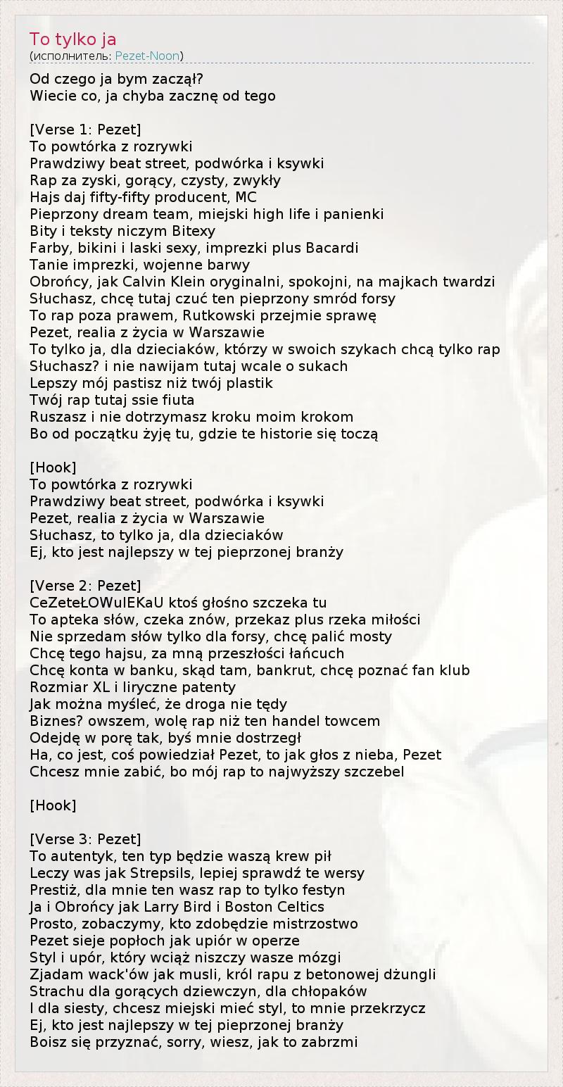 Od czego ja bym zaczął? Wiecie co, ja chyba zacznę od tego [Verse 1: Pezet] To powtórka z rozrywki Prawdziwy beat street, podwórka i ksywki Rap za zyski, gorący, czysty, zwykły Hajs daj fifty-fifty producent, MC Pieprzony dream team, miejski high life i panienki Bity i teksty niczym Bitexy Farby, bikini i laski sexy, imprezki plus Bacardi Tanie imprezki, wojenne barwy Obrońcy, jak Calvin Klein oryginalni, spokojni, na majkach twardzi Słuchasz, chcę tutaj czuć ten pieprzony smród forsy To rap poza prawem, Rutkowski przejmie sprawę Pezet, realia z życia w Warszawie To tylko ja, dla dzieciaków, którzy w swoich szykach chcą tylko rap Słuchasz? i nie nawijam tutaj wcale o sukach Lepszy mój pastisz niż twój plastik Twój rap tutaj ssie fiuta Ruszasz i nie dotrzymasz kroku moim krokom Bo od początku żyję tu, gdzie te historie się toczą [Hook] To powtórka z rozrywki Prawdziwy beat street, podwórka i ksywki Pezet, realia z życia w Warszawie Słuchasz, to tylko ja, dla dzieciaków Ej, kto jest najlepszy w tej pieprzonej branży [Verse 2: Pezet] CeZeteŁOWuIEKaU ktoś głośno szczeka tu To apteka słów, czeka znów, przekaz plus rzeka miłości Nie sprzedam słów tylko dla forsy, chcę palić mosty Chcę tego hajsu, za mną przeszłości łańcuch Chcę konta w banku, skąd tam, bankrut, chcę poznać fan klub Rozmiar XL i liryczne patenty Jak można myśleć, że droga nie tędy Biznes? owszem, wolę rap niż ten handel towcem Odejdę w porę tak, byś mnie dostrzegł Ha, co jest, coś powiedział Pezet, to jak głos z nieba, Pezet Chcesz mnie zabić, bo mój rap to najwyższy szczebel [Hook] [Verse 3: Pezet] To autentyk, ten typ będzie waszą krew pił Leczy was jak Strepsils, lepiej sprawdź te wersy Prestiż, dla mnie ten wasz rap to tylko festyn Ja i Obrońcy jak Larry Bird i Boston Celtics Prosto, zobaczymy, kto zdobędzie mistrzostwo Pezet sieje popłoch jak upiór w operze Styl i upór, który wciąż niszczy wasze mózgi Zjadam wack'ów jak musli, król rapu z betonowej dżungli Strachu dla gorących dziewczyn, dla chłopaków I dla siesty, chcesz miejski mieć styl, to mnie przekrzycz Ej, kto jest najlepszy w tej pieprzonej branży Boisz się przyznać, sorry, wiesz, jak to zabrzmi