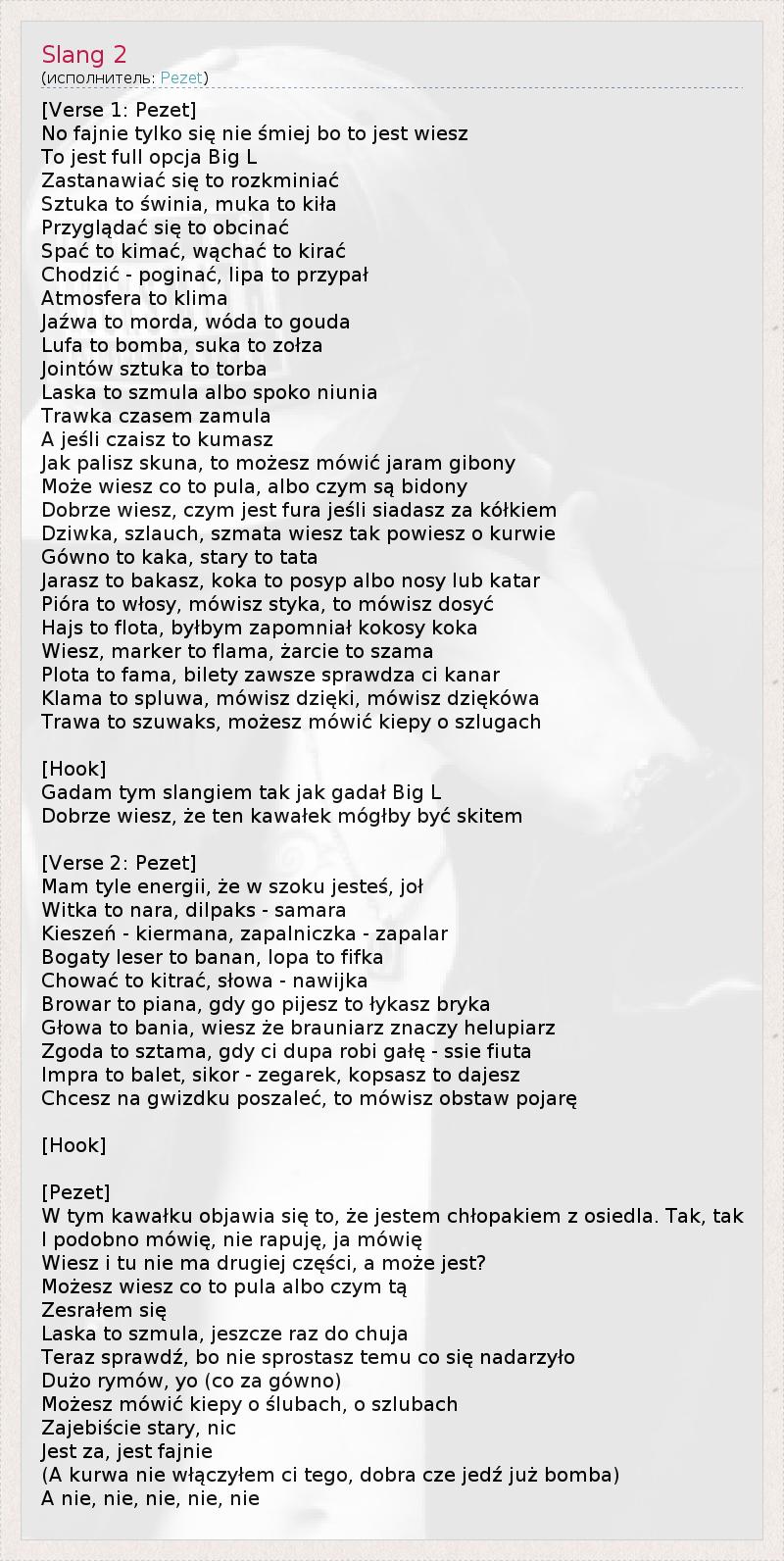 [Verse 1: Pezet] No fajnie tylko się nie śmiej bo to jest wiesz To jest full opcja Big L Zastanawiać się to rozkminiać Sztuka to świnia, muka to kiła Przyglądać się to obcinać Spać to kimać, wąchać to kirać Chodzić - poginać, lipa to przypał Atmosfera to klima Jaźwa to morda, wóda to gouda Lufa to bomba, suka to zołza Jointów sztuka to torba Laska to szmula albo spoko niunia Trawka czasem zamula A jeśli czaisz to kumasz Jak palisz skuna, to możesz mówić jaram gibony Może wiesz co to pula, albo czym są bidony Dobrze wiesz, czym jest fura jeśli siadasz za kółkiem Dziwka, szlauch, szmata wiesz tak powiesz o kurwie Gówno to kaka, stary to tata Jarasz to bakasz, koka to posyp albo nosy lub katar Pióra to włosy, mówisz styka, to mówisz dosyć Hajs to flota, byłbym zapomniał kokosy koka Wiesz, marker to flama, żarcie to szama Plota to fama, bilety zawsze sprawdza ci kanar Klama to spluwa, mówisz dzięki, mówisz dziękówa Trawa to szuwaks, możesz mówić kiepy o szlugach [Hook] Gadam tym slangiem tak jak gadał Big L Dobrze wiesz, że ten kawałek mógłby być skitem [Verse 2: Pezet] Mam tyle energii, że w szoku jesteś, joł Witka to nara, dilpaks - samara Kieszeń - kiermana, zapalniczka - zapalar Bogaty leser to banan, lopa to fifka Chować to kitrać, słowa - nawijka Browar to piana, gdy go pijesz to łykasz bryka Głowa to bania, wiesz że brauniarz znaczy helupiarz Zgoda to sztama, gdy ci dupa robi gałę - ssie fiuta Impra to balet, sikor - zegarek, kopsasz to dajesz Chcesz na gwizdku poszaleć, to mówisz obstaw pojarę [Hook] [Pezet] W tym kawałku objawia się to, że jestem chłopakiem z osiedla. Tak, tak I podobno mówię, nie rapuję, ja mówię Wiesz i tu nie ma drugiej części, a może jest? Możesz wiesz co to pula albo czym tą Zesrałem się Laska to szmula, jeszcze raz do chuja Teraz sprawdź, bo nie sprostasz temu co się nadarzyło Dużo rymów, yo (co za gówno) Możesz mówić kiepy o ślubach, o szlubach Zajebiście stary, nic Jest za, jest fajnie (A kurwa nie włączyłem ci tego, dobra cze jedź już bomba) A nie, nie, nie, nie, nie
